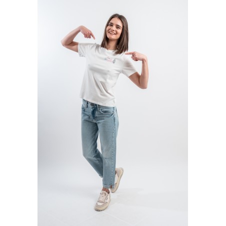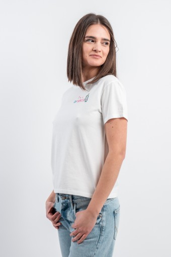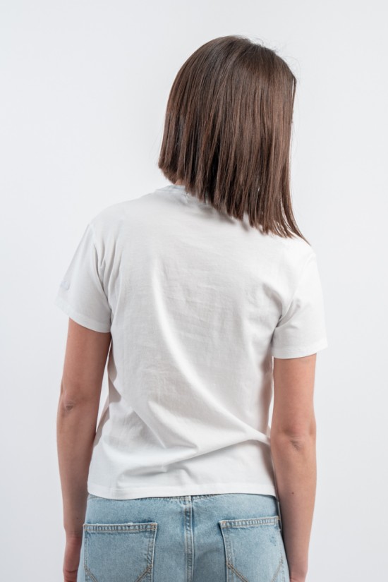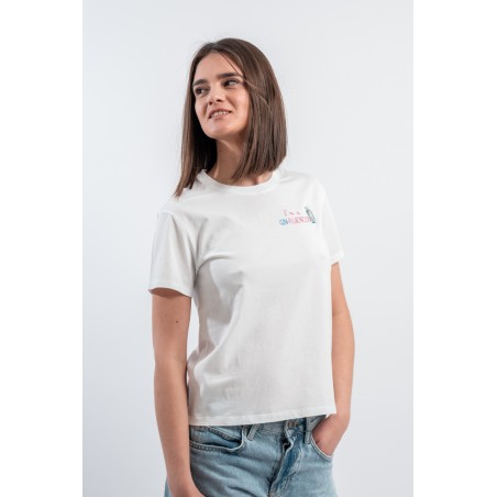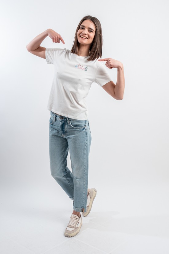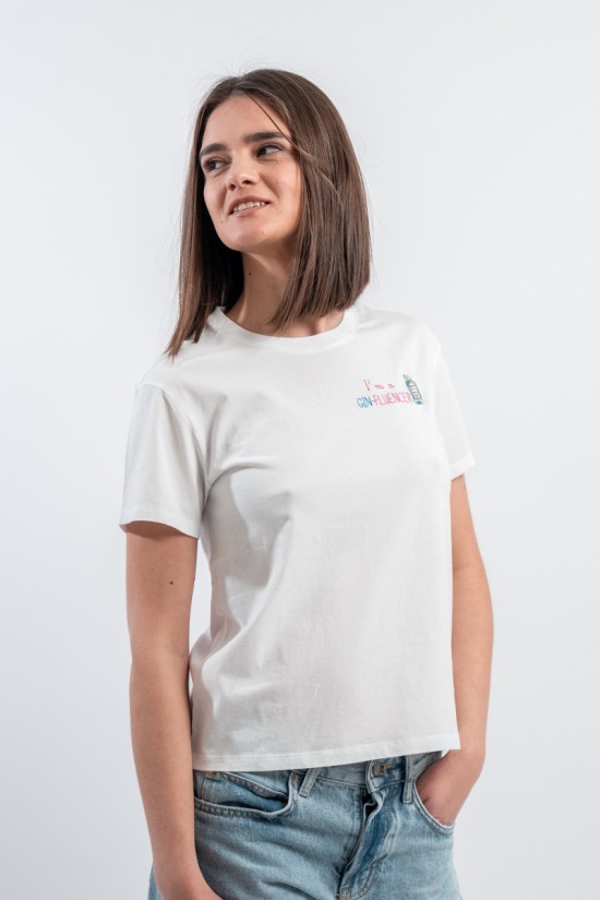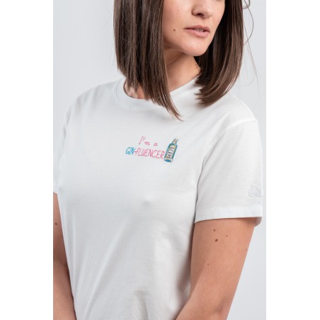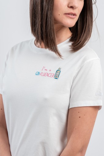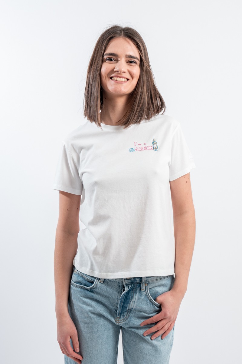 Crewneck T-shirt made of 100% cotton yarn, short sleeves. Embellished with "I'm a GIN-FLUENCER" embroidery on the chest. With a versatile and glamorous style, perfect for any occasion of use, it is an original garment, like the wearer!