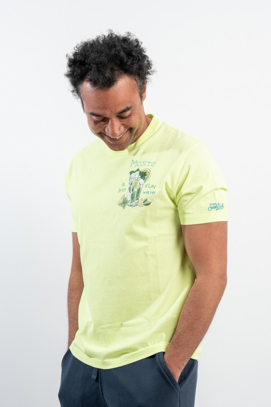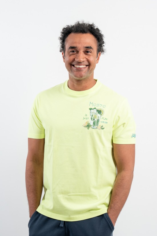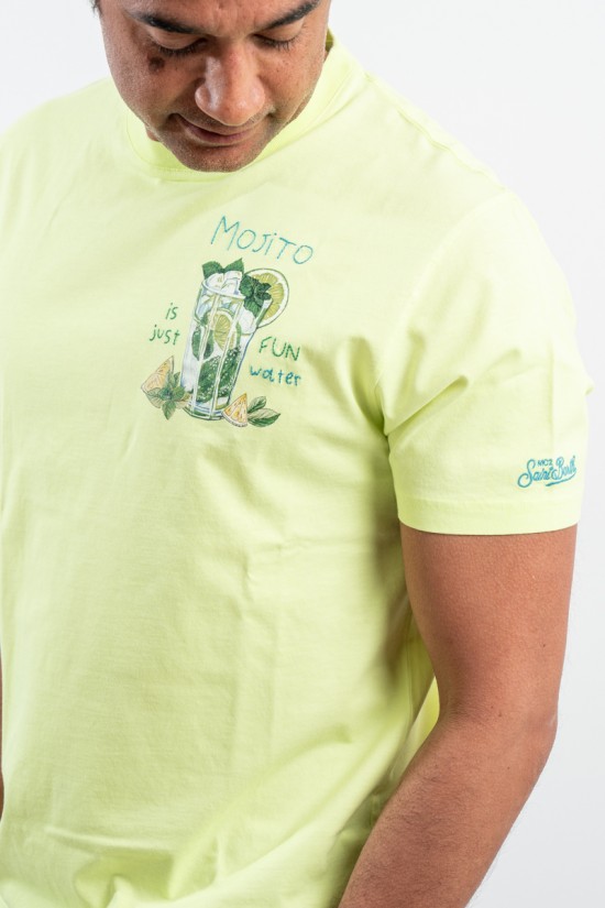 MC2 SAINT BARTH crewneck T-shirt made of 100% cotton yarn. Featuring embossed "Mojito is just Fin water" embroidery on the chest. Institutional logo embroidered on the sleeve. Informal and original, it is suitable for any occasion.