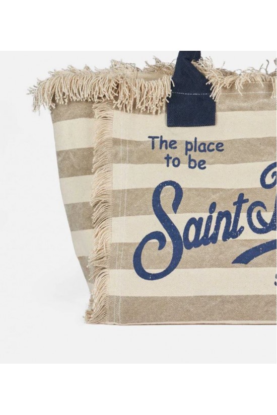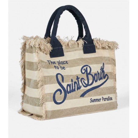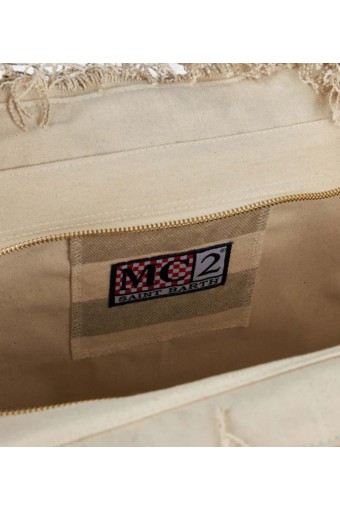 Versatile and roomy solid color bag. Enriched with fringes along the edges, it is made of sturdy cotton canvas, with practical and resistant handles, zip closure and two service pockets. Ideal for any summer day!