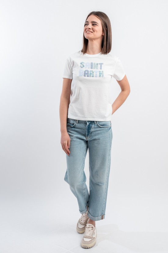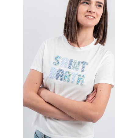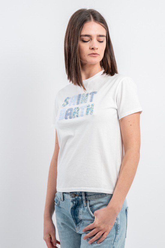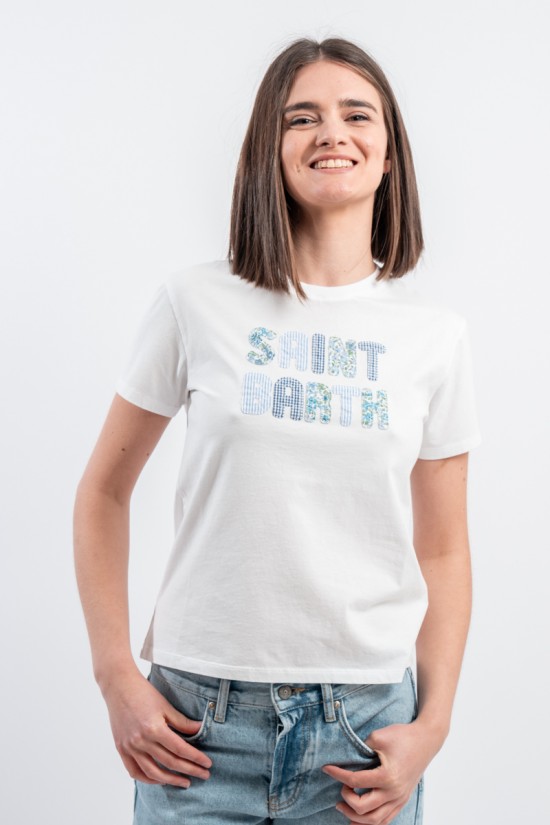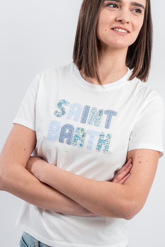 Crewneck T-shirt made of 100% cotton yarn, short sleeves. Embellished with an embroidered "Saint Barth" patch on the chest. With a versatile and glamorous style, perfect for any occasion of use, it is an original garment, like the wearer!