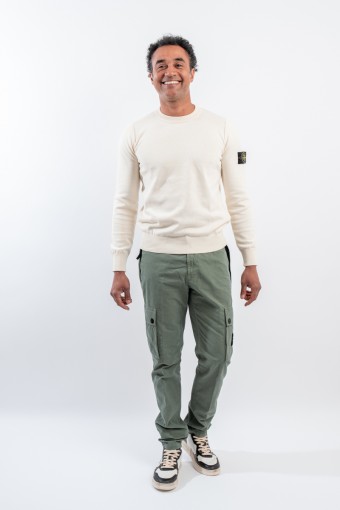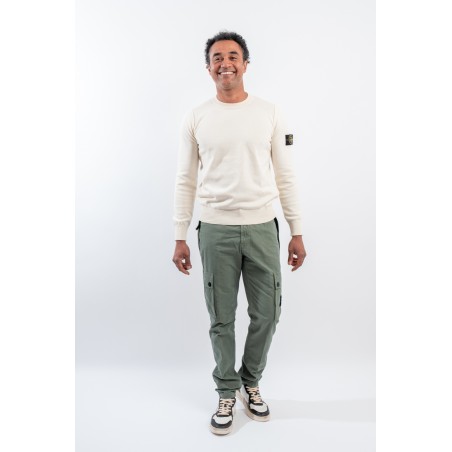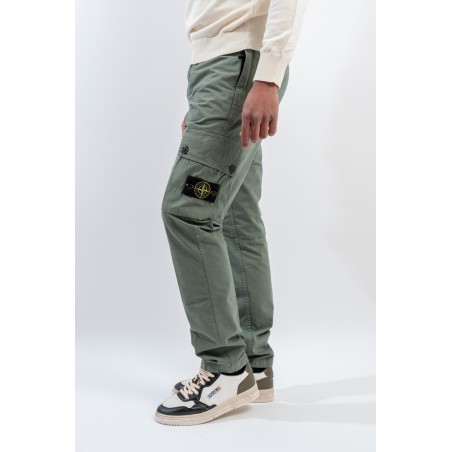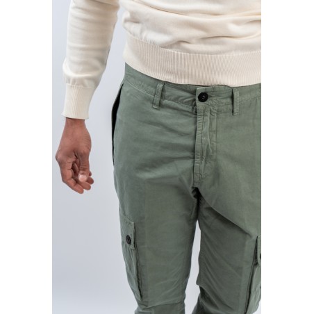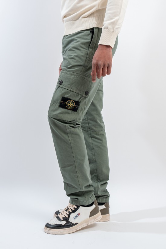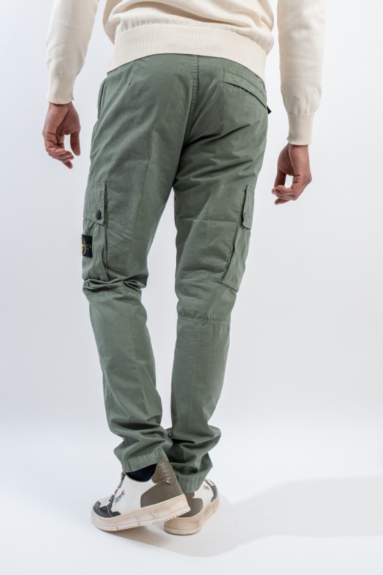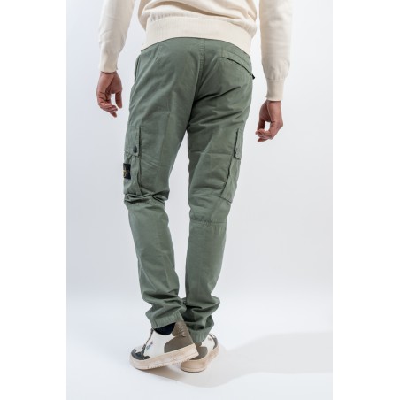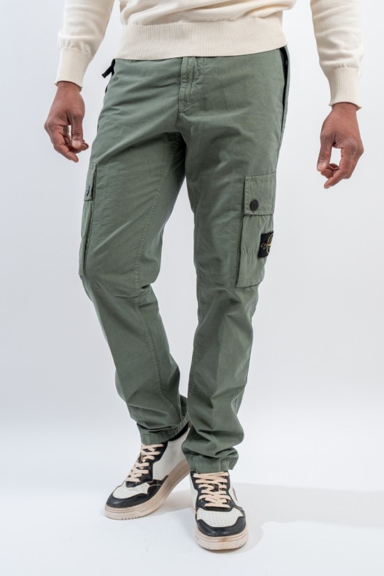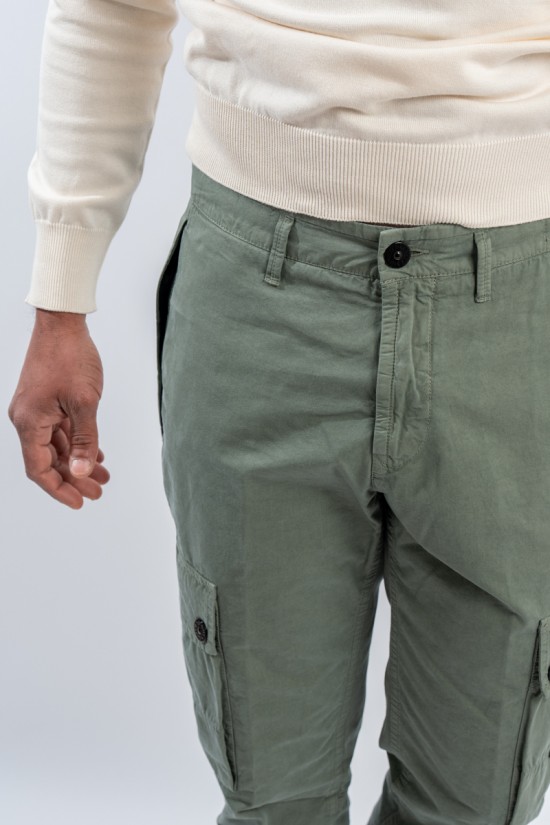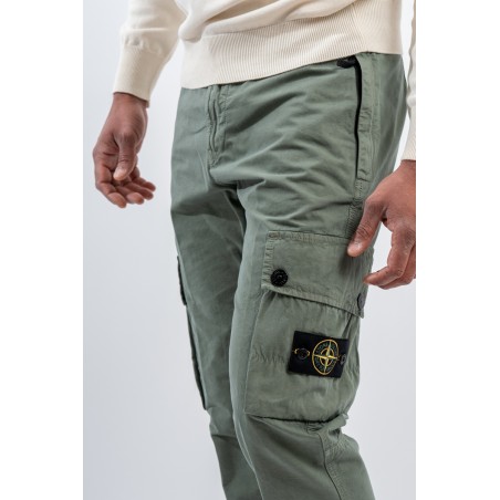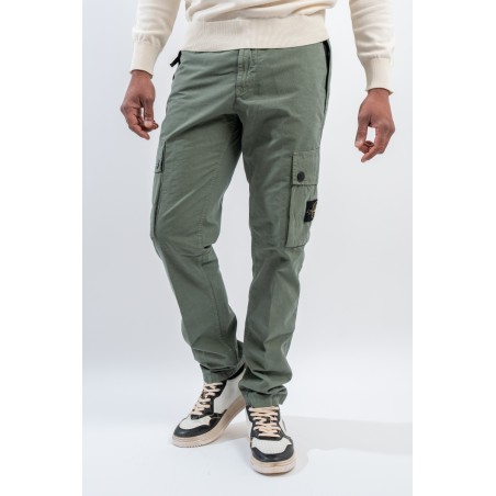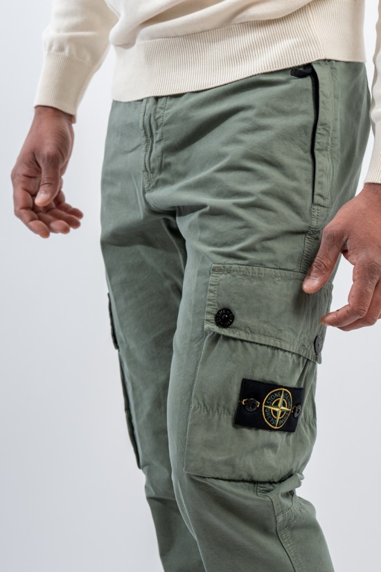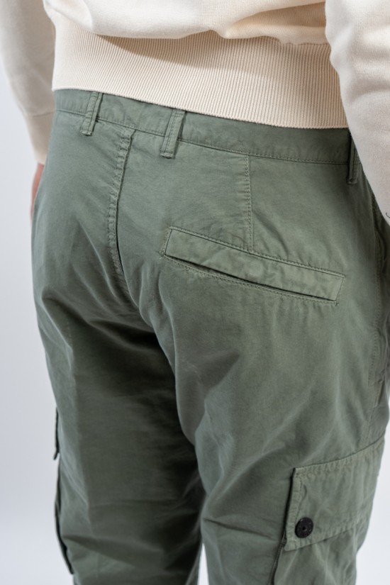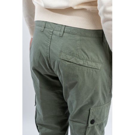 Stone Isalnd cargo trousers in brushed organic cotton canvas, with a slim fit and a slightly worn look thanks to the 'OLD' treatment. Equipped with numerous functional pockets: standing pockets with hidden zip, back slit pocket with hidden snap button and bellows patch pockets on the legs with flap and button. Embellished with the iconic STONE ISLAND badge on the left pocket that adds a distinctive touch. Ideal for a practical and contemporary style, with careful details and a robust design.