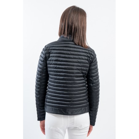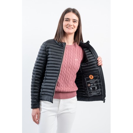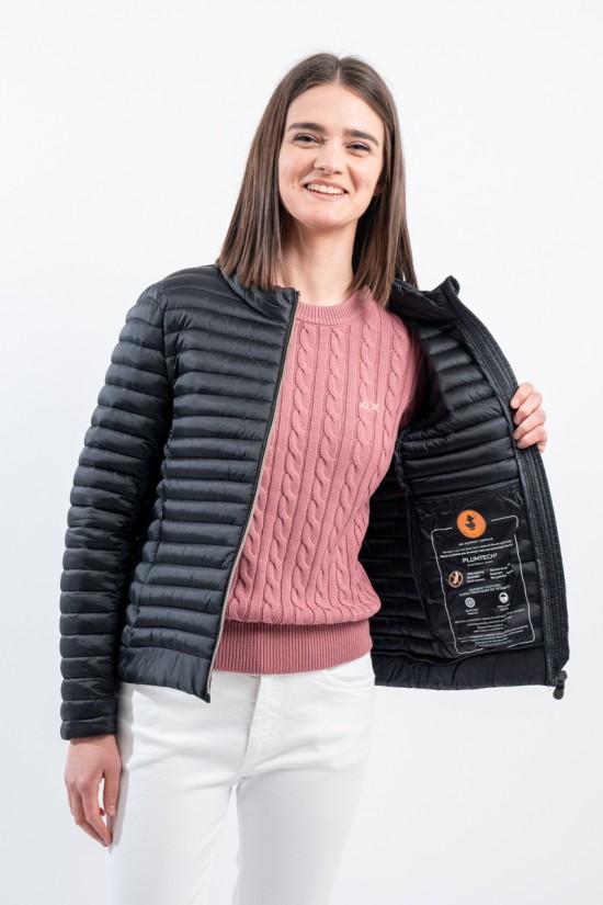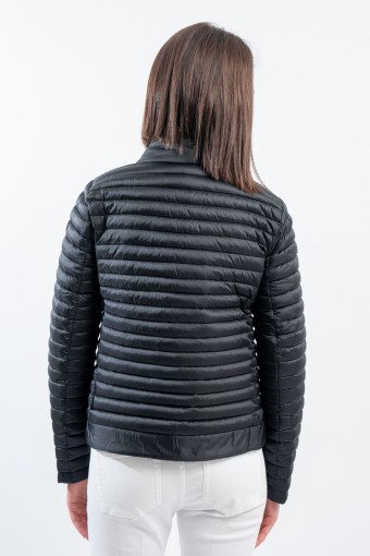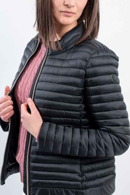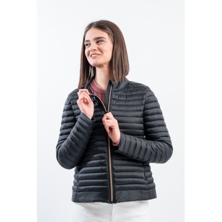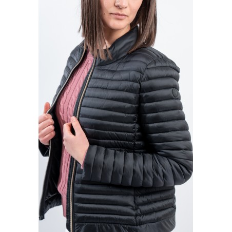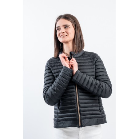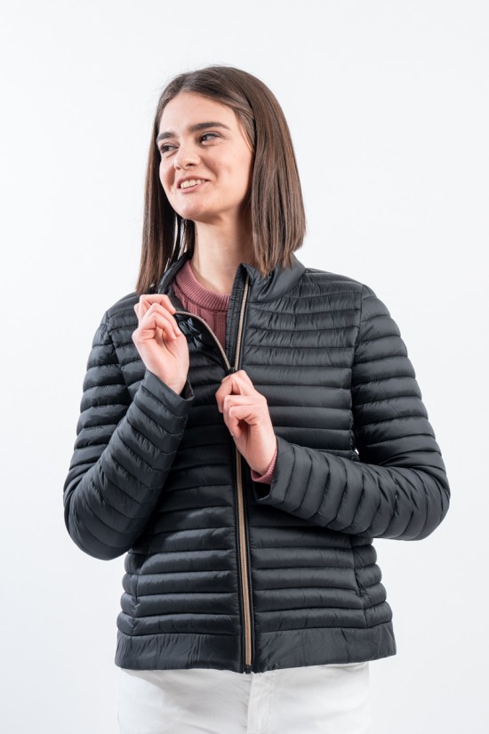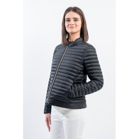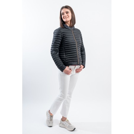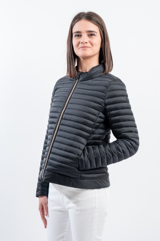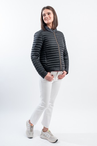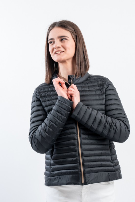 The Alyssa down jacket by SAVE THE DUCK, made of lightweight quilted nylon, has an A-line with a stand-up collar and smooth detail on the bottom. Equipped with a shiny zip and practical side pockets, it stands out for its personalized zip pullers and the round tone-on-tone logo applied on the left sleeve. The animal-free design and comfortable fit make it ideal for cold days, offering style, practicality and respect for animals. A versatile and refined garment, perfect for an urban and modern look.