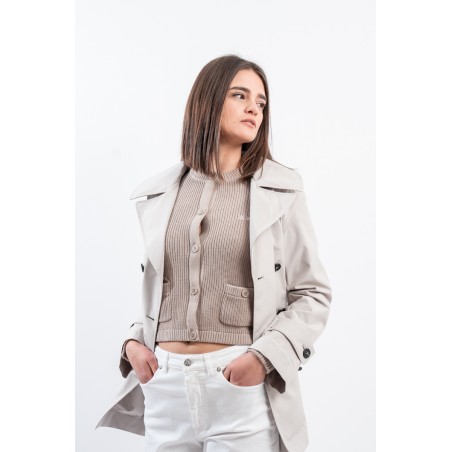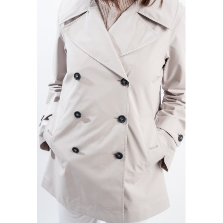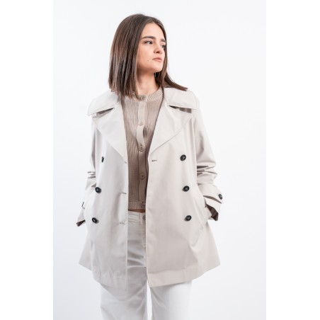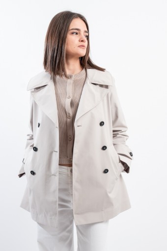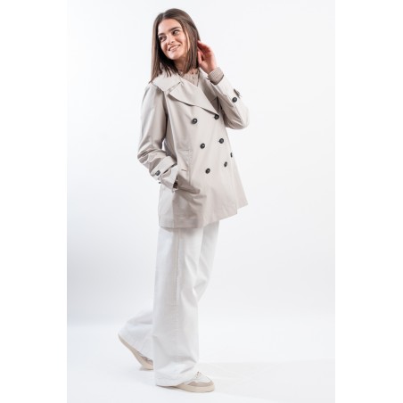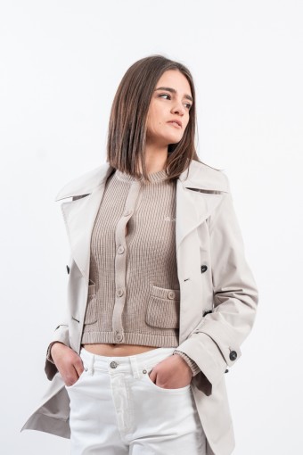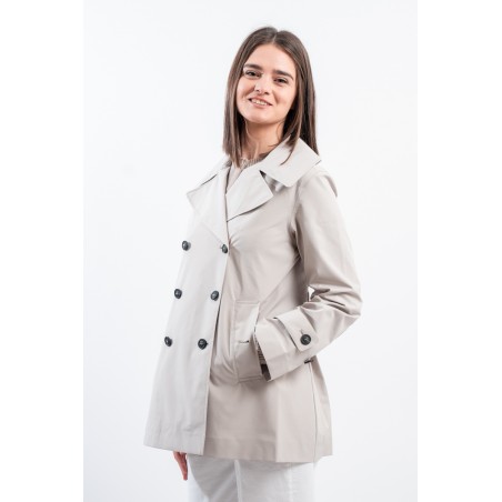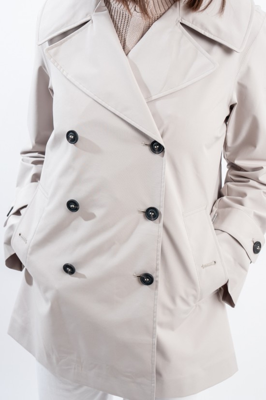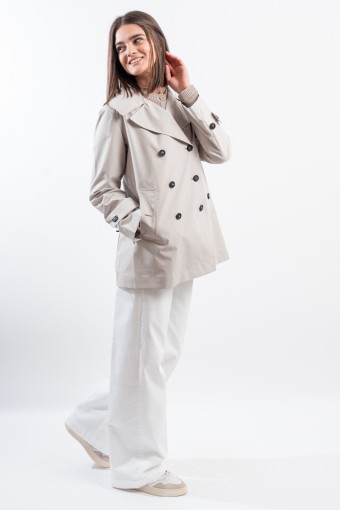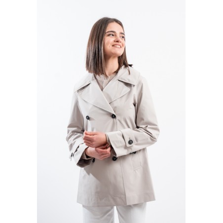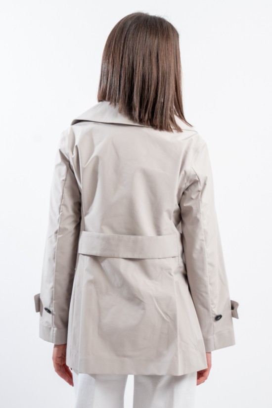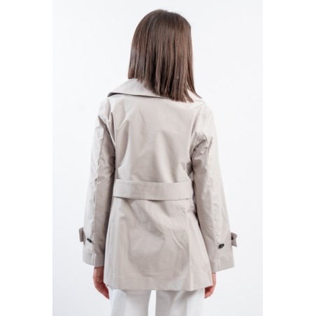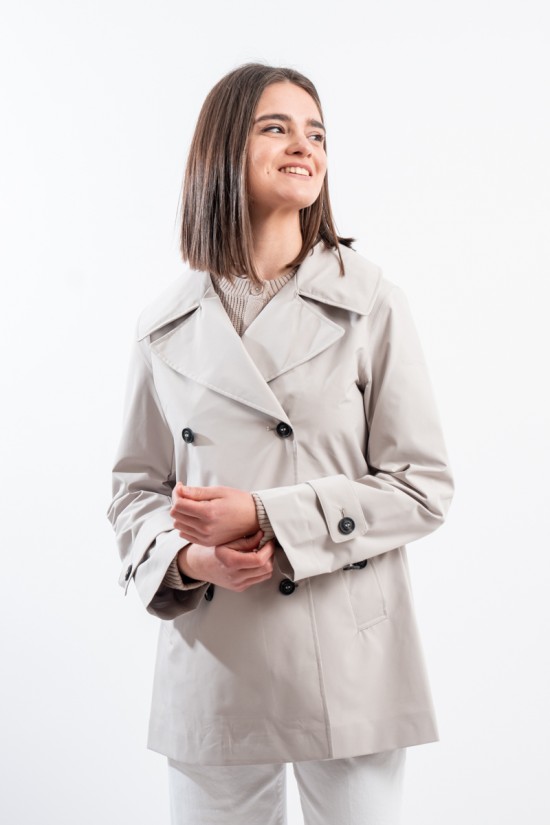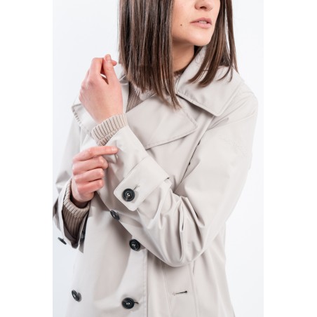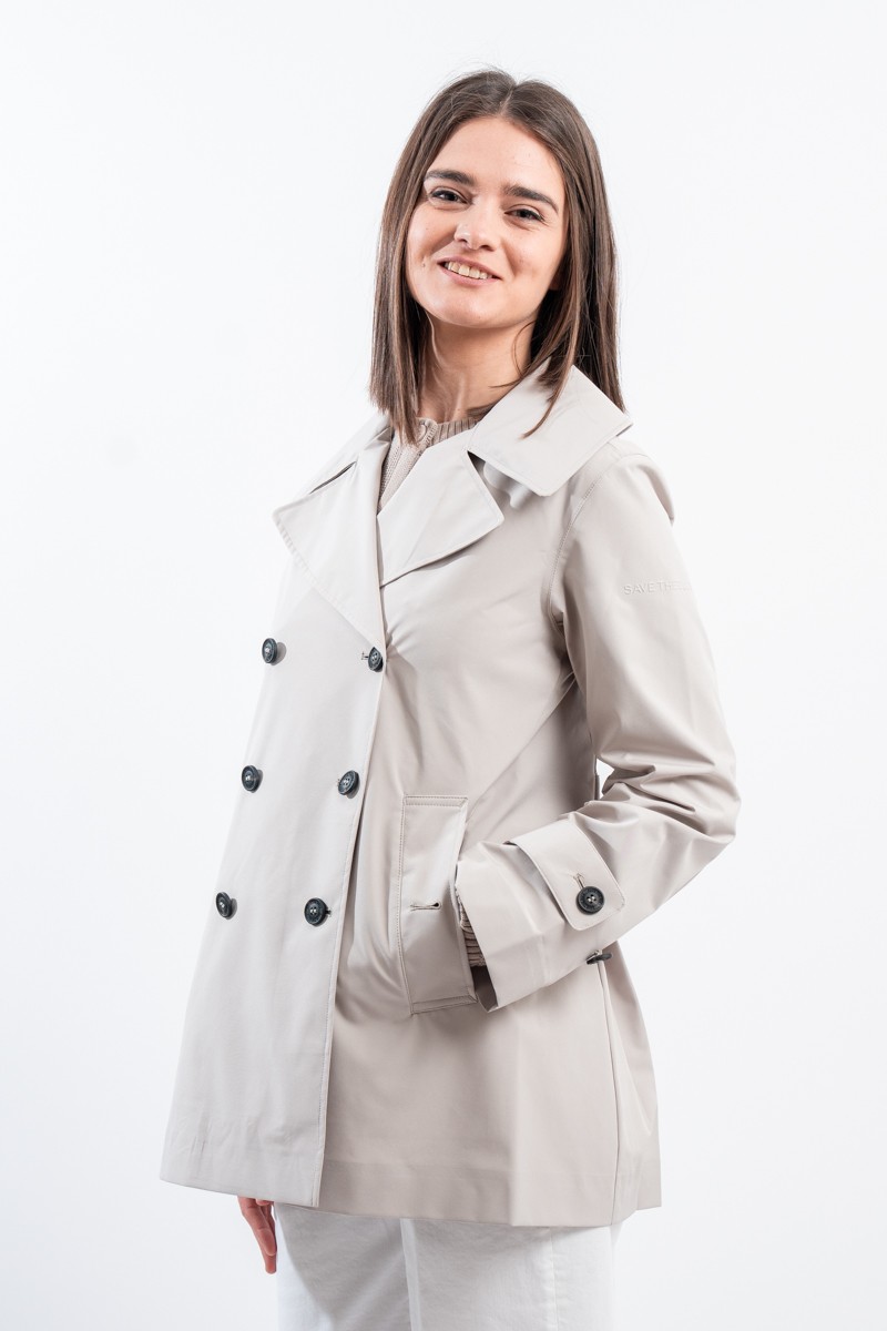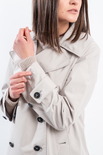 The Sofi trench coat by SAVE THE DUCK reinvents the classic English model, with a short and wide cut, lapels and martingale on the back. Made of technical fabric with taped seams, it features a double-breasted closure and adjustable straps at the wrists. The personalized black buttons with rubberized finish and the hot-glued logo on the sleeve are distinctive details of the animal-free style, combining elegance and functionality in a versatile and sustainable garment.