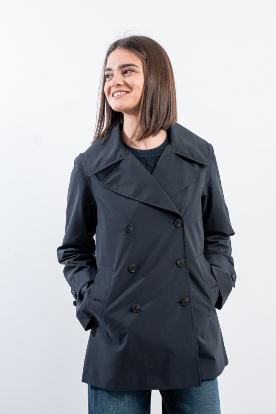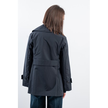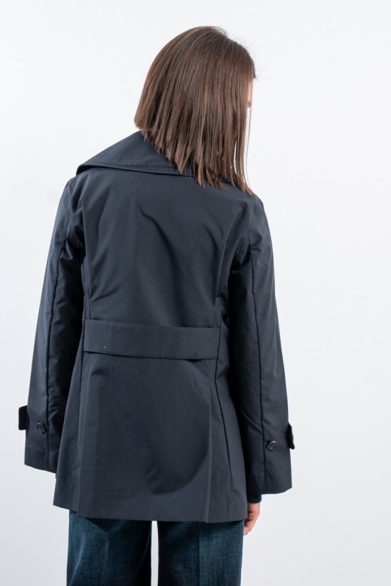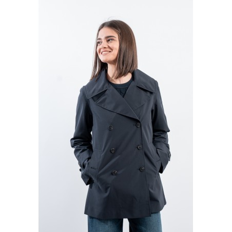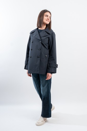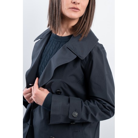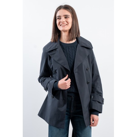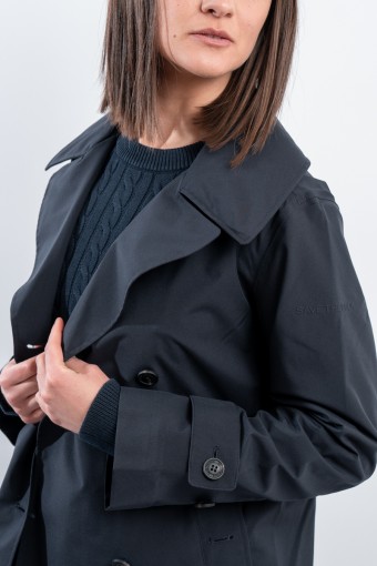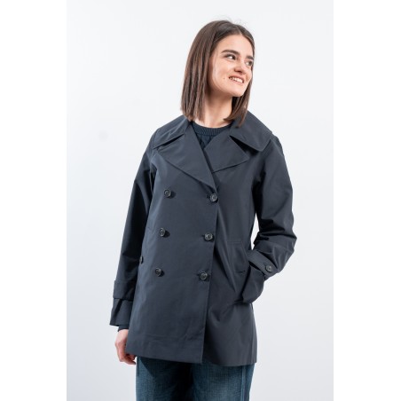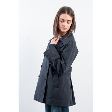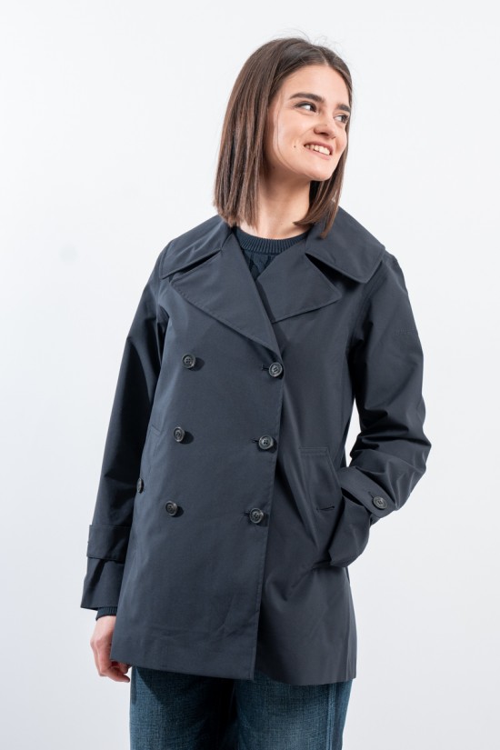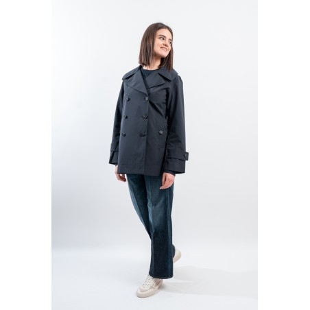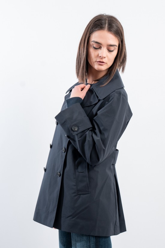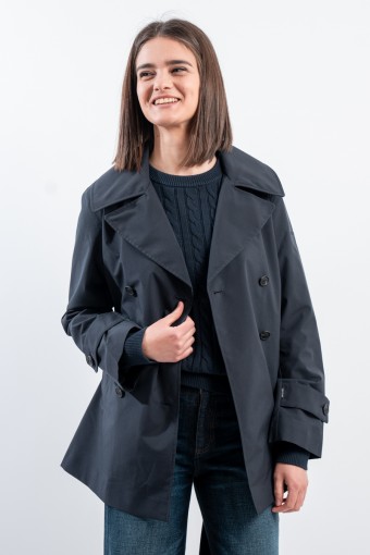 The Sofi trench coat by SAVE THE DUCK reinvents the classic English model, with a short and wide cut, lapels and martingale on the back. Made of technical fabric with taped seams, it features a double-breasted closure and adjustable straps at the wrists. The personalized black buttons with rubberized finish and the hot-glued logo on the sleeve are distinctive details of the animal-free style, combining elegance and functionality in a versatile and sustainable garment.
