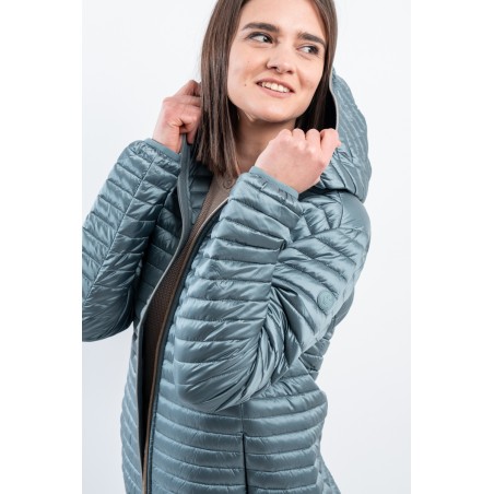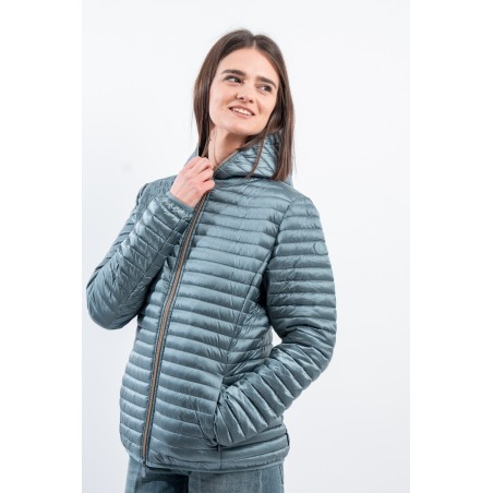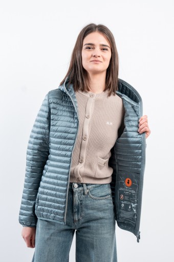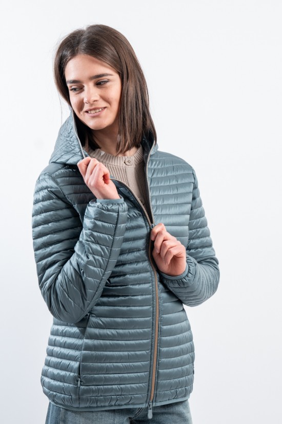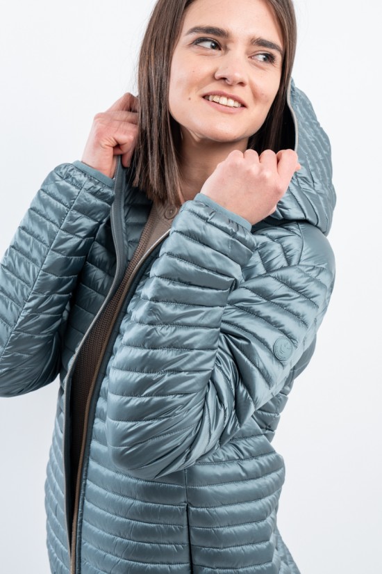 The Alexa down jacket by SAVE THE DUCK combines a refined quilted texture, a bright fabric and PLUMTECH® padding, for ecological and stylish comfort. Equipped with a fixed hood, two-way closure and practical side pockets. Finished with Lycra cuffs and hem for a perfect fit. It stands out for its personalized zipper pulls and the round badge on the left sleeve, offering elegance and sustainability in a versatile and trendy garment.