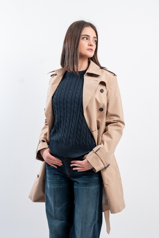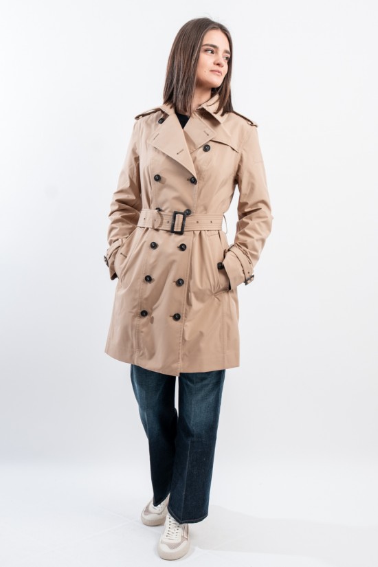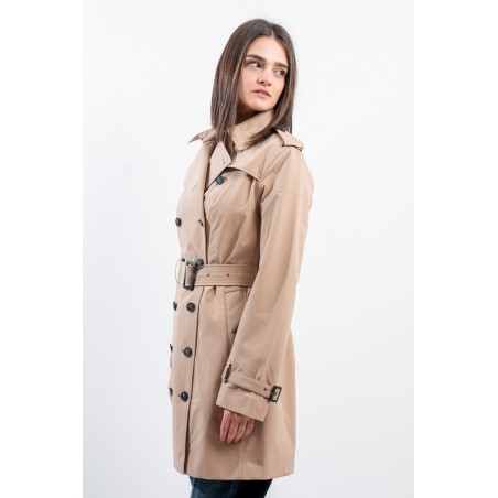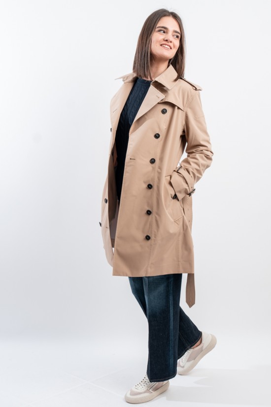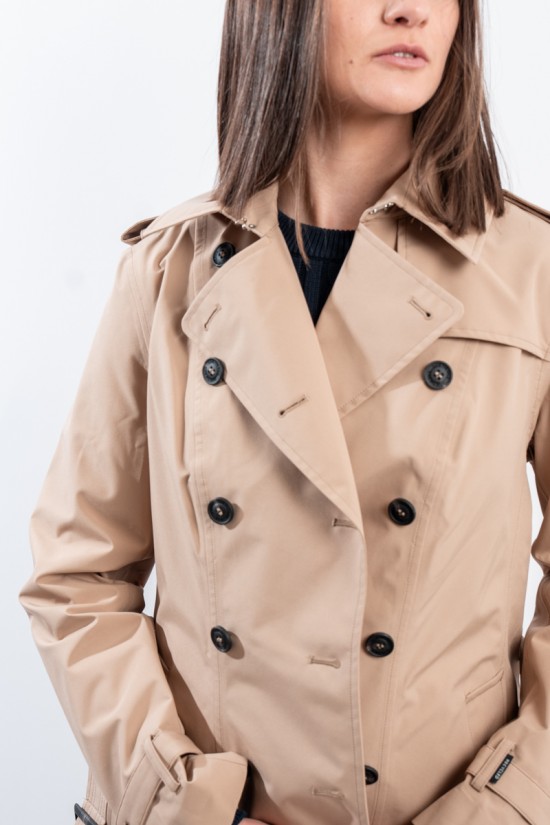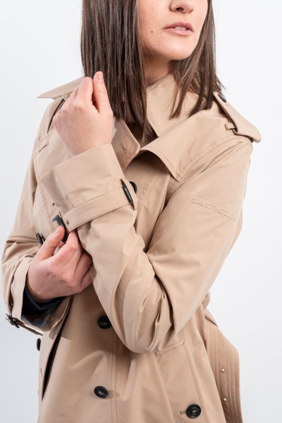 The Audrey slim-fit trench coat, made of lightweight recycled polyester, combines style and sustainability. It protects against rain and wind thanks to the technical fabric and heat-taped seams. Classic English details, such as the double-breasted closure, topstitched waist belt and adjustable wrist straps, make the model elegant and practical. The logo engraved on the rubberized buttons and the hot-glued badge on the left sleeve testify to the animal-free commitment and our distinctive style.