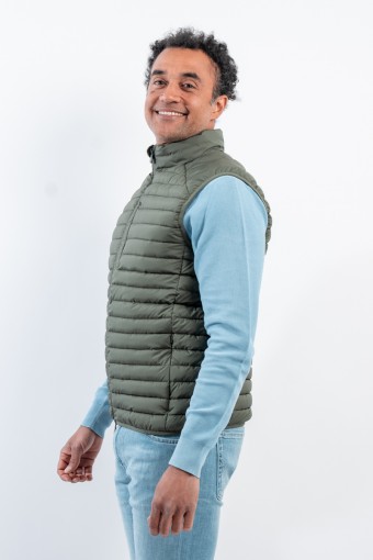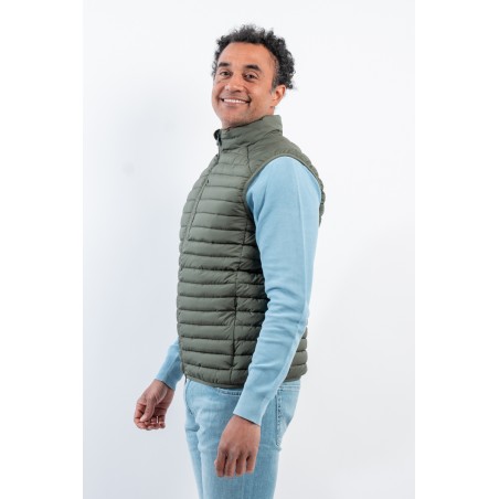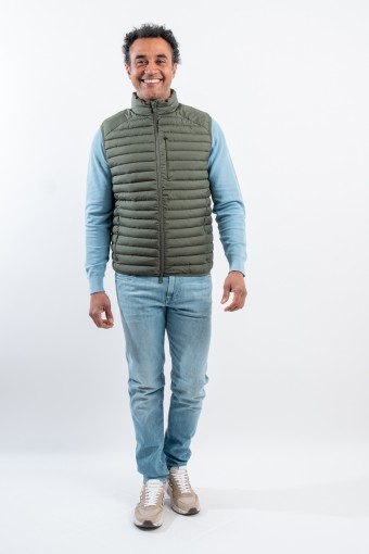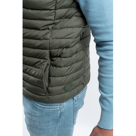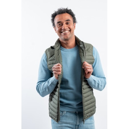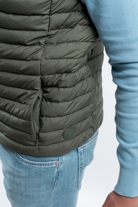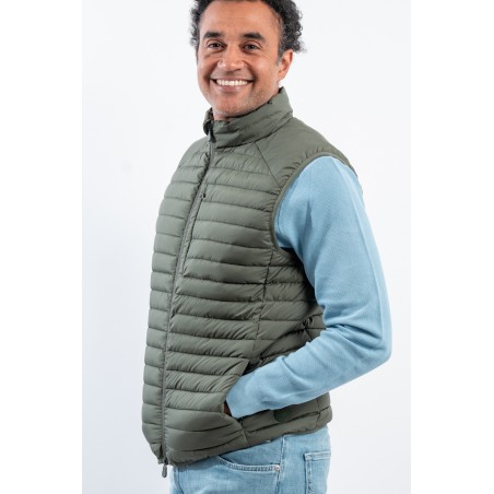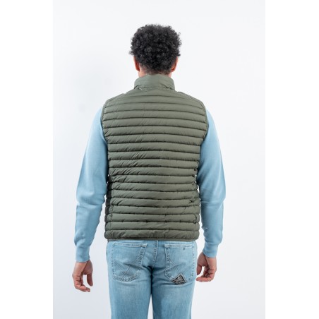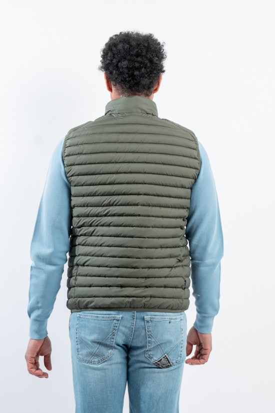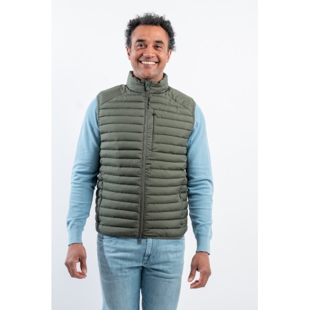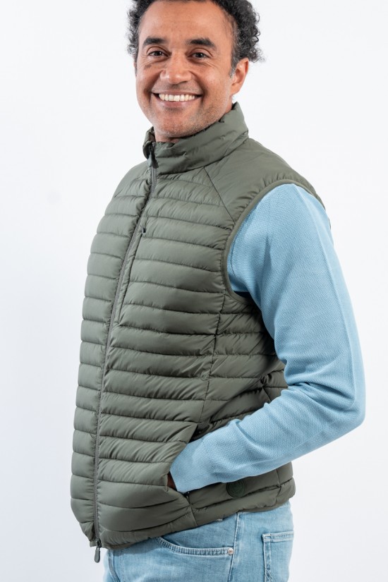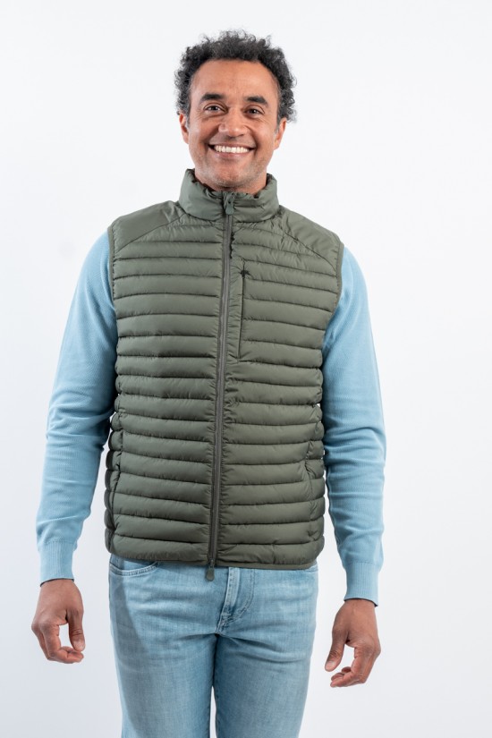 Slim-fit vest padded in soft and lightweight plumtech, ideal for everyday use. Breathable and water-repellent. Two-way full zip with log-in zip puller. Classic boudin quilting. GIRO elasticated sleeve and hem. Side and chest pockets closed with welt zip. Resealable in the practical bag supplied.