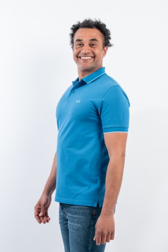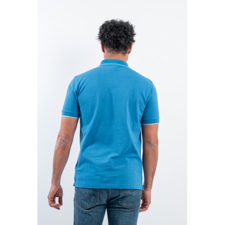 2-button short-sleeved polo shirt made of stretch piquèt. Side slits on the bottom. Ribbed collar and sleeve edge. Characterized by bright and classic colors with contrasting profiles. Embroidered logo on the chest. Slim fit.