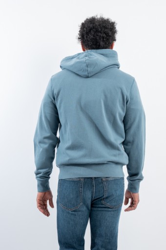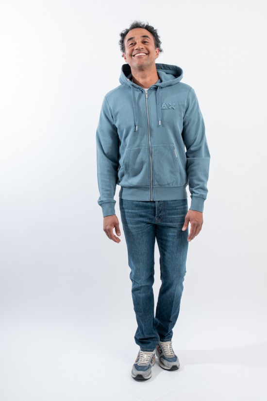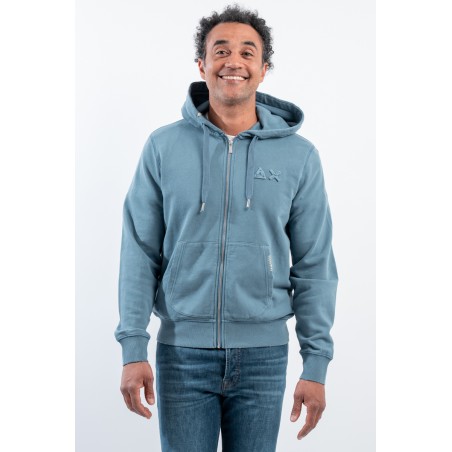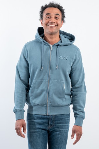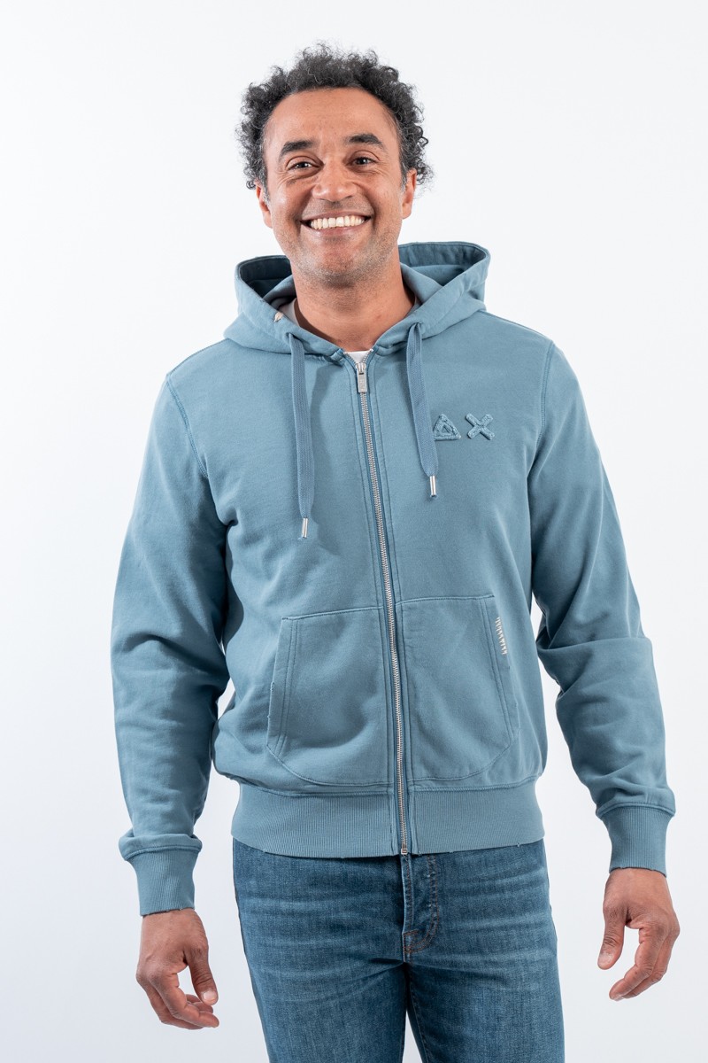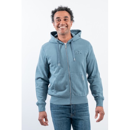 Stretch cotton sweatshirt with zipper. Featuring the logo embroidered with tone-on-tone SUN68 Patch on the chest. With hood and drawstring adjustment. Ribbed sleeves and bottom. Kangaroo pockets with contrasting detail.
