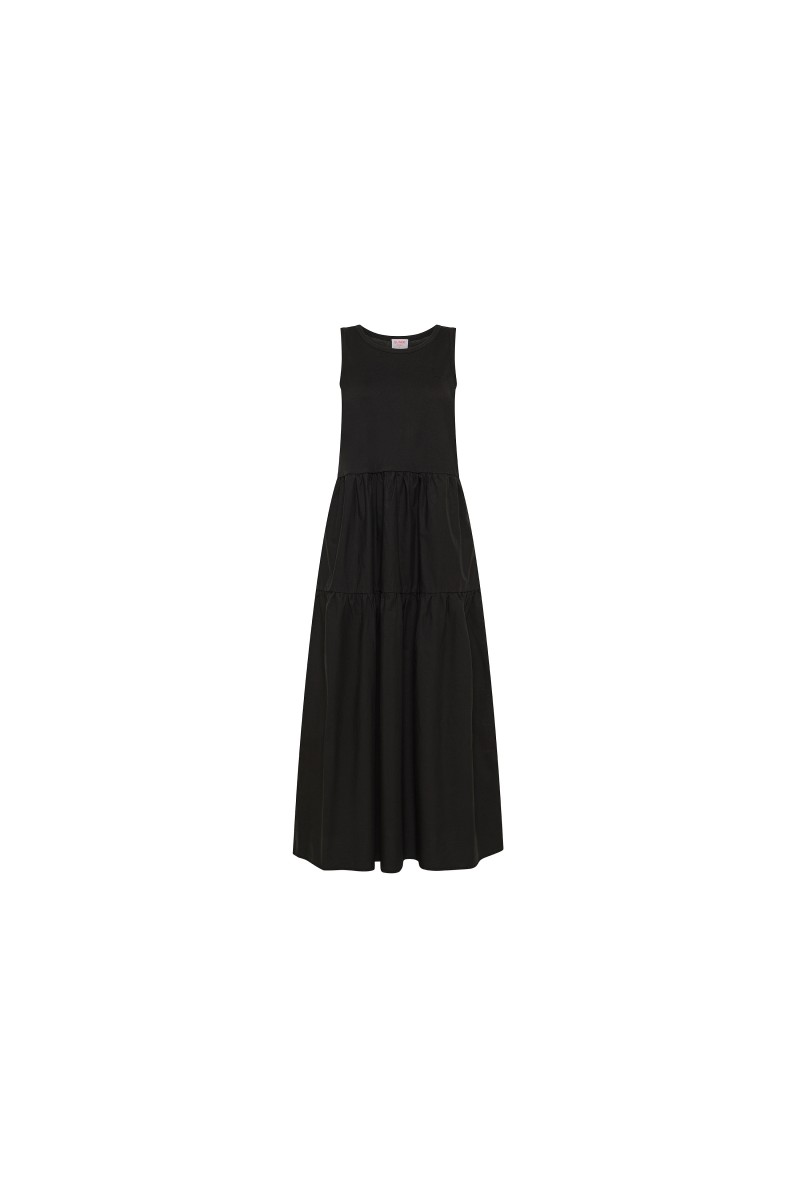 Solid color SUN68 dress made of jersey and cotton poplin. Round and sleeveless neck. Embellished with flounces on the bottom. Institutional logo embroidered on the chest. Perfect to complete your everyday outfit in style.
