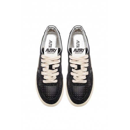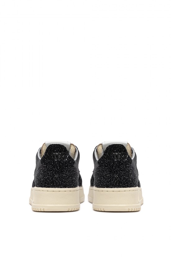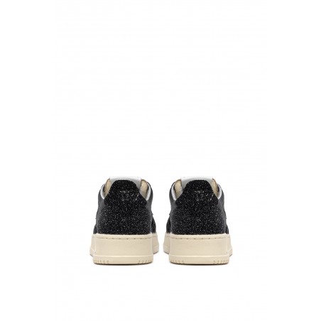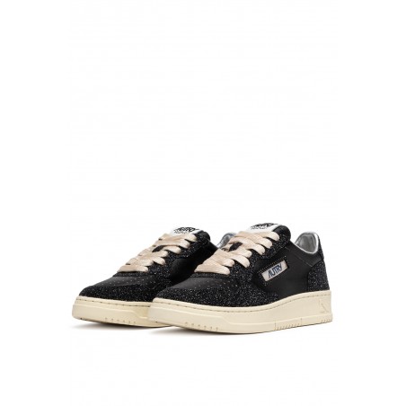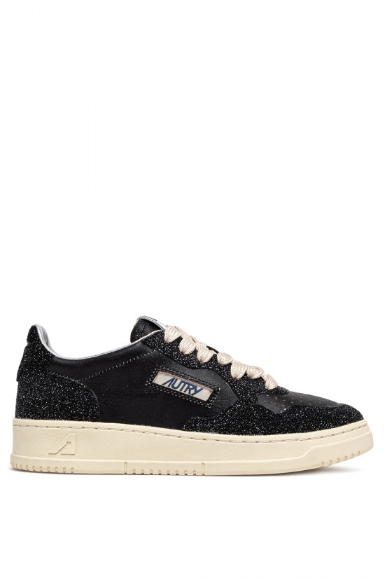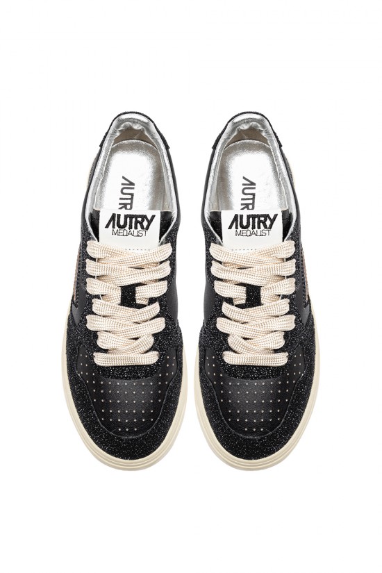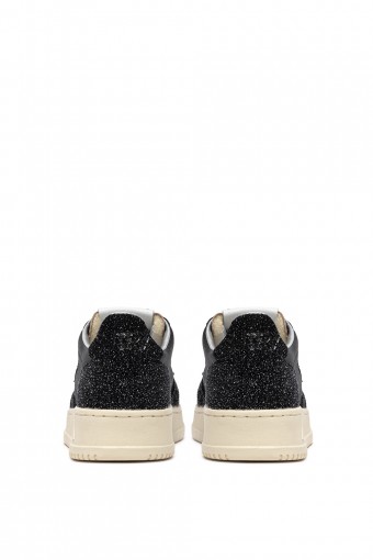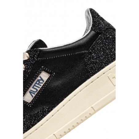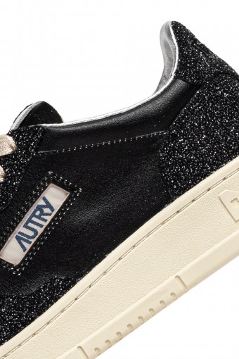 The iconic AUTRY Medalist combines elegance and style with black leather and black glitter suede. Silver laminated leather interior, piping and insole add sophistication, while ivory shiny flat laces complete the sophisticated design. The logo applied on the outer sides gives a distinctive touch. The beige rubber sole ensures comfort and stability, making this sneaker versatile and trendy. Perfect for an elegant and classy look, it combines fashion and functionality in an impeccable way. Its originality is identified in the American flag that characterizes each model.
