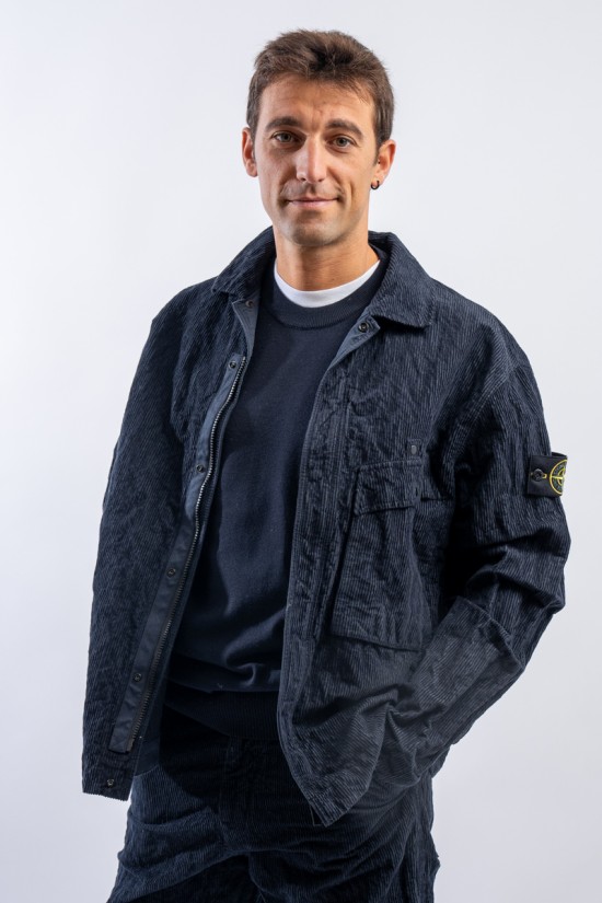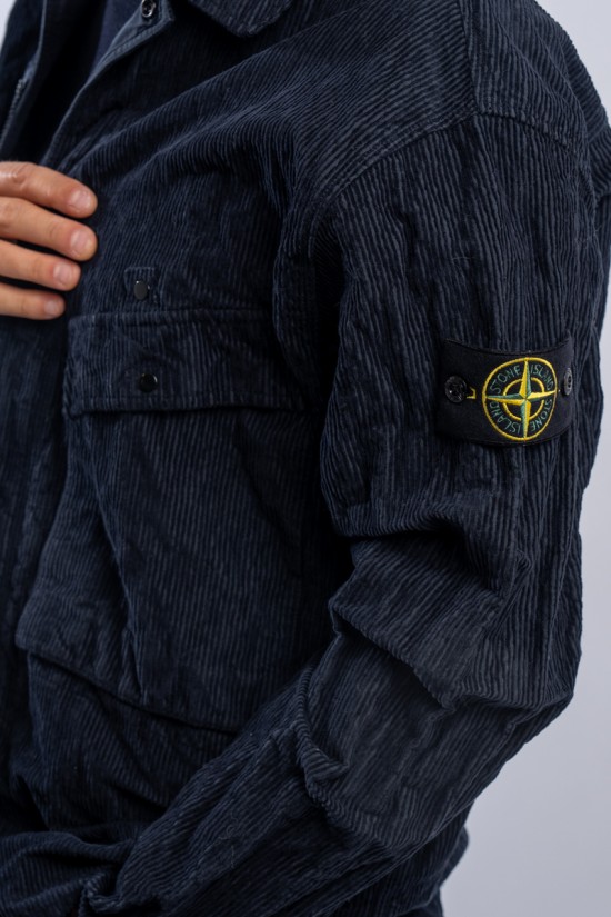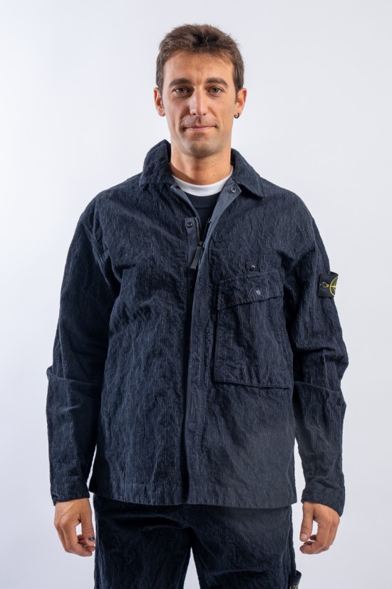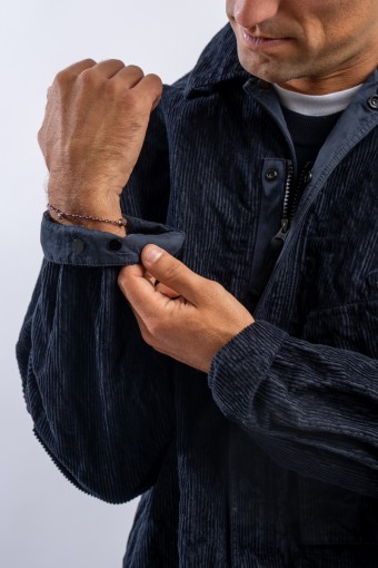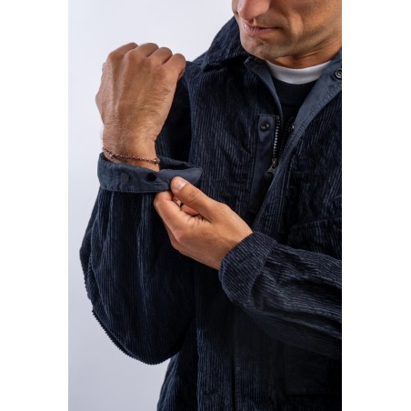 Washed corduroy shirt jacket. Made of cotton and nylon with a firm and crisp hand. Two-way zip closure protected by flap with buttons. Patch pocket on the chest and inevitable badge on the left sleeve.