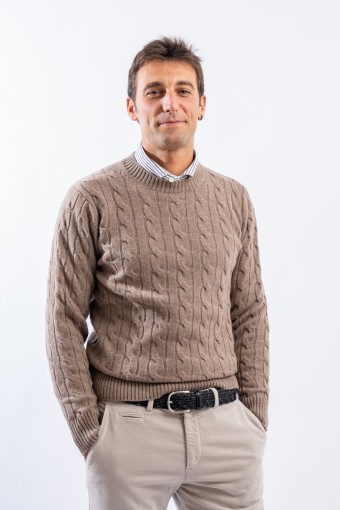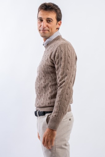 Elegant crewneck sweater with cable and ribs. It is made of extra-fine merino, with a rich and bright appearance. Made in Italy.