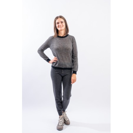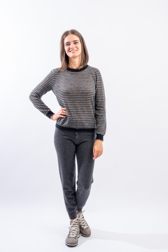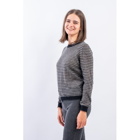 Crewneck sweater with long sleeves made of a light wool and alpaca yarn perfect in warm and heated environments. It has frayed finishes on the collar and profiles that give a modern and refined touch. Made in Italy.