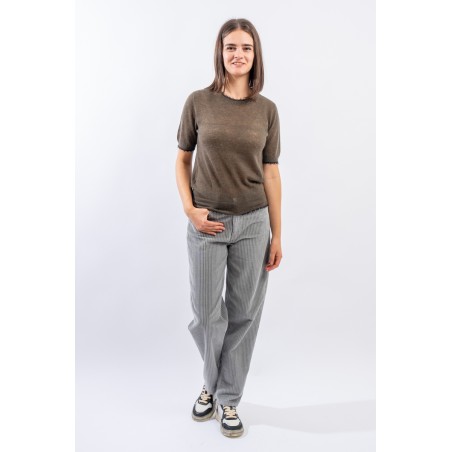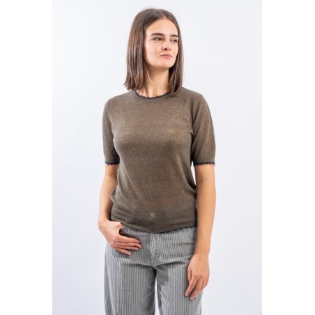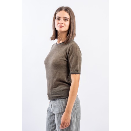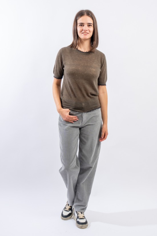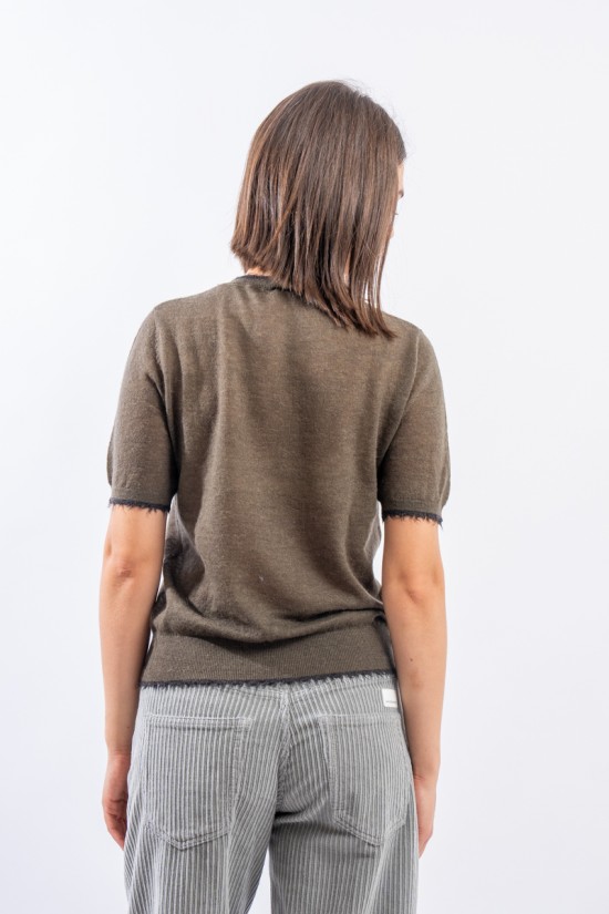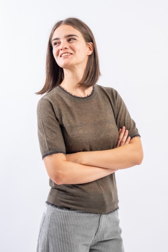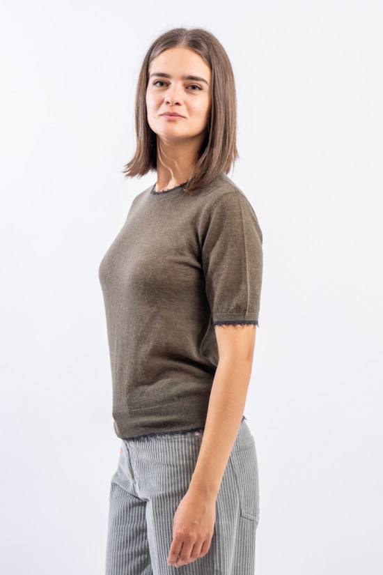 Crewneck sweater with elbow-length sleeves made of a light wool and alpaca yarn perfect as an underjacket in heated environments. It has frayed finishes on the collar and profiles that give a modern and refined touch. Made in Italy.