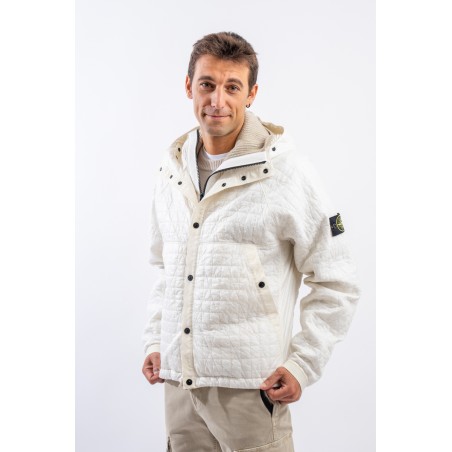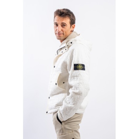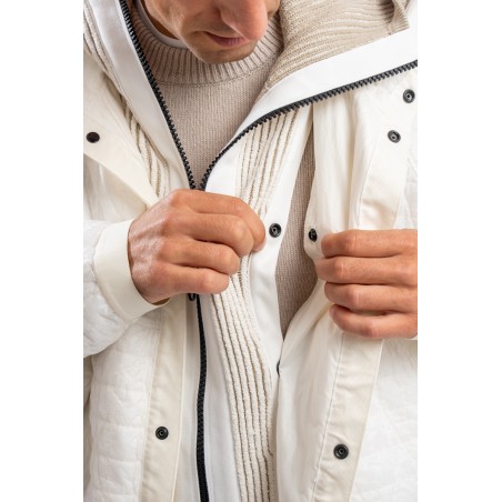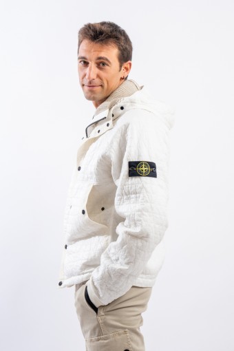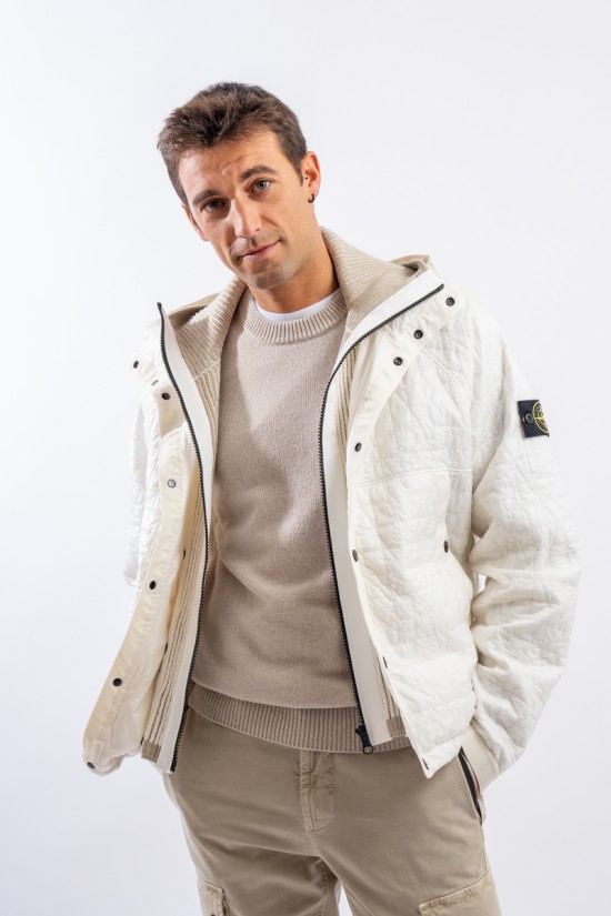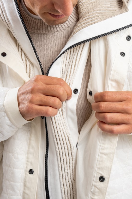 A real collector's item! Bomber jacket made of crinkle and padded with wadding. Ideal in transitional seasons, warm and light with reduced volumes. Embellished with the classic removable knit front panel. It is enriched and personalized with numerous tone-on-tone cordura details. Very beautiful!