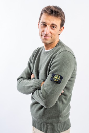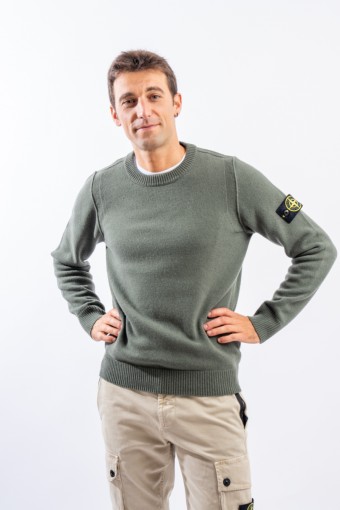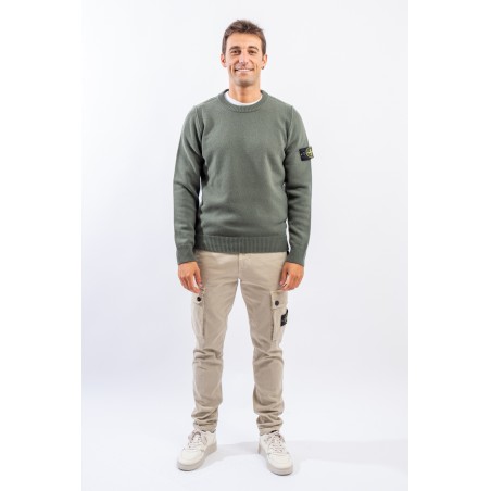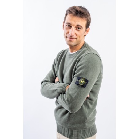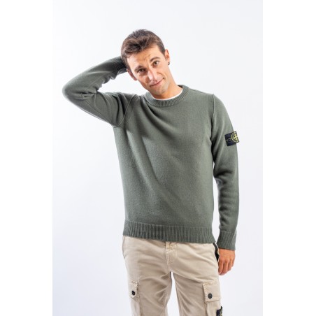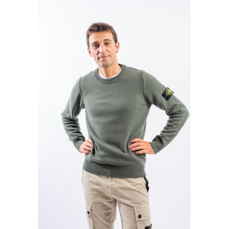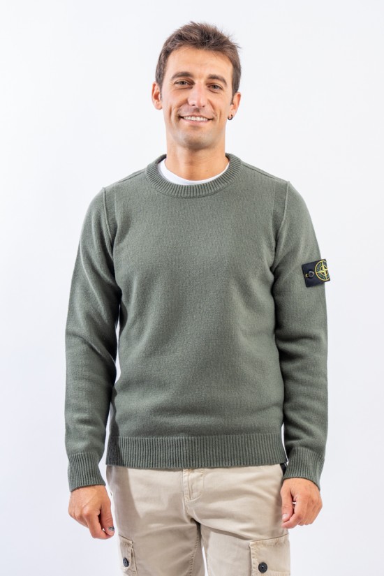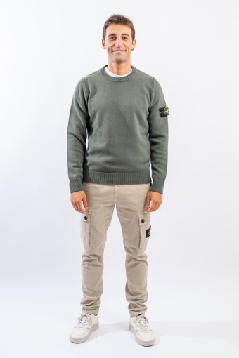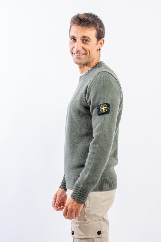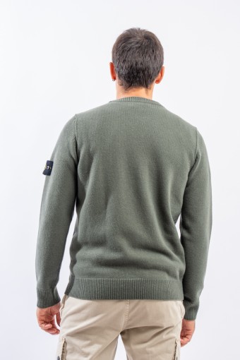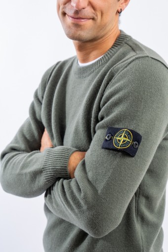 Iconic lambswool crewneck sweater with intarsia on the armholes, ribbed collar and edges. Gauge 7 with the inevitable badge applied.