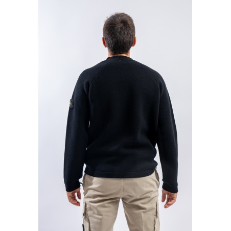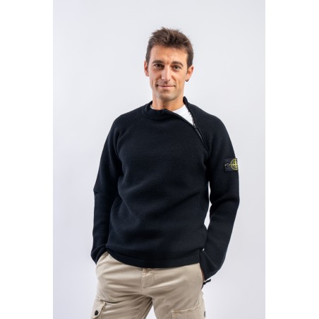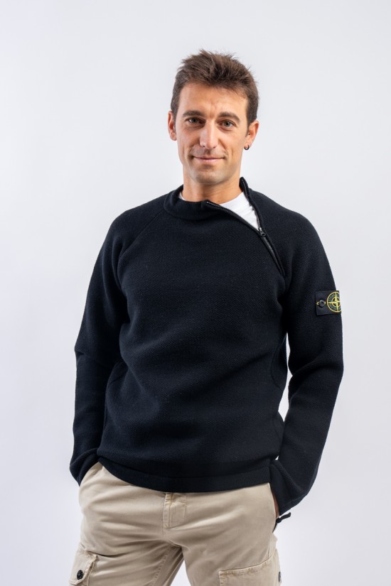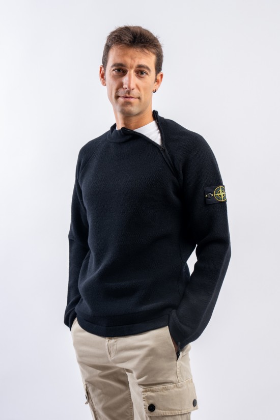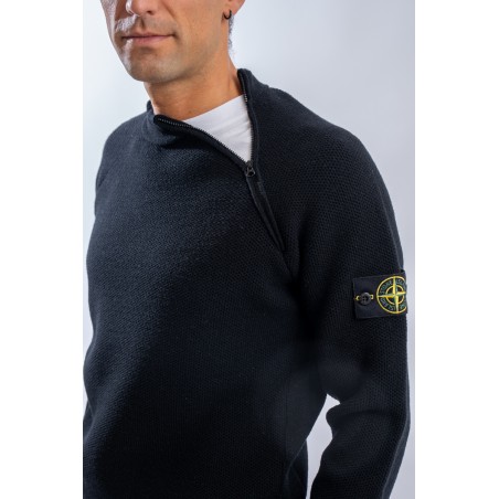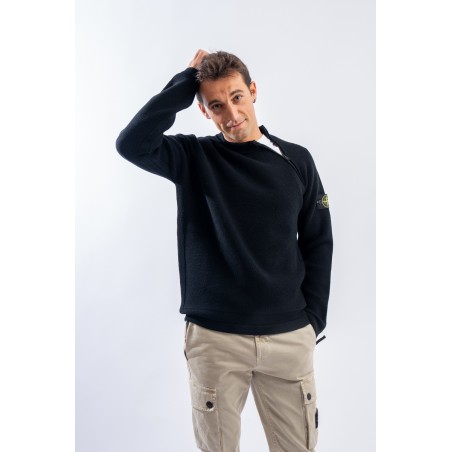 Elasticated honeycomb inlaid sweater. Characterized by the cub collar with diagonal zip, elasticated cuffs and iconic badge on the left sleeve. Fineness 12.