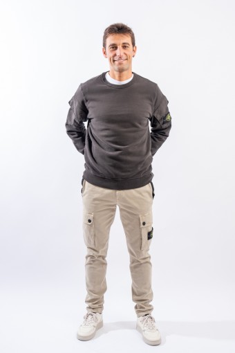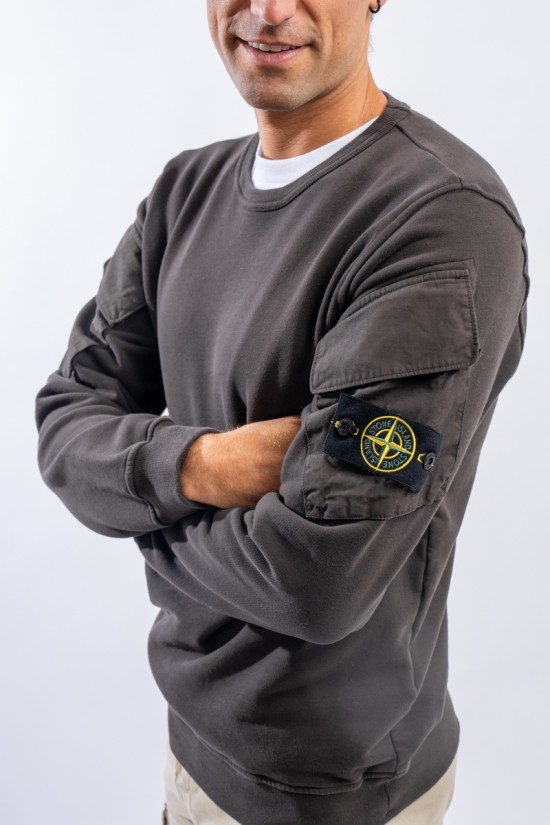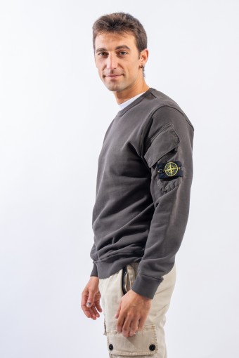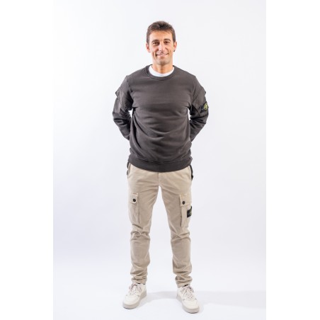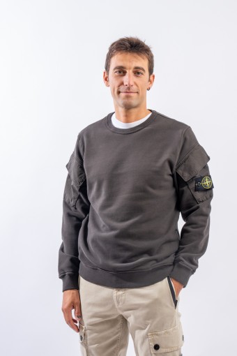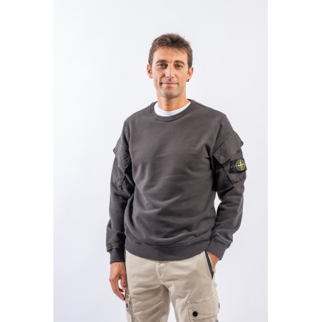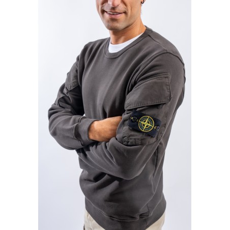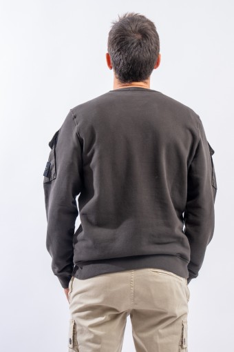 Crewneck sweatshirt in brushed organic cotton. Military-inspired, it features a double patch pocket on the sleeves with contrasting gusset and snap fly. Garment dyed, it is soft and warm to face the winter in style.