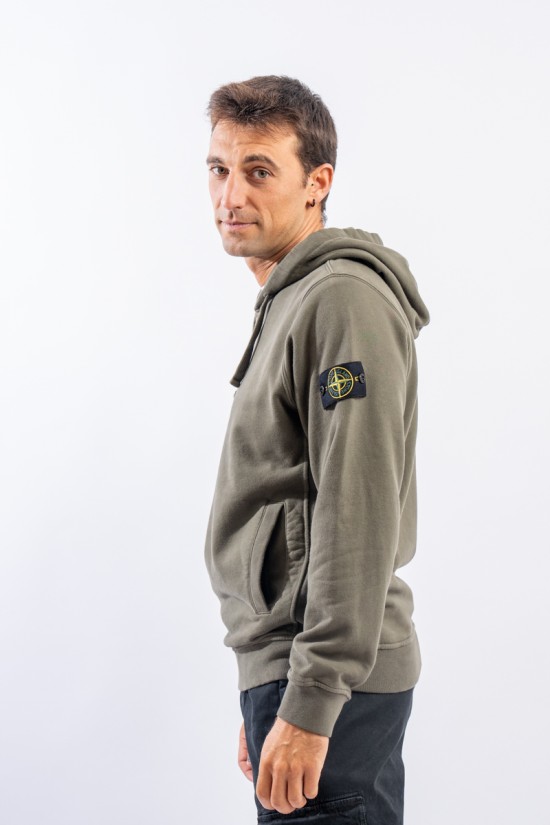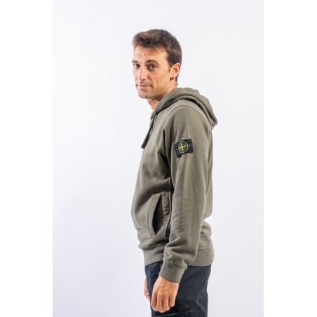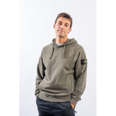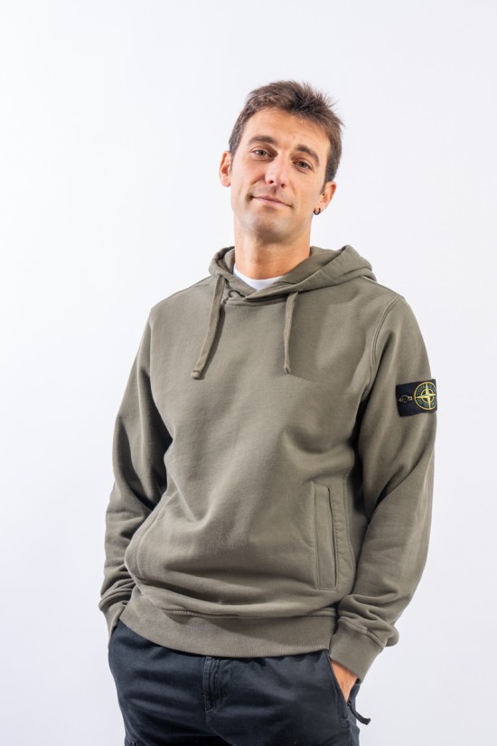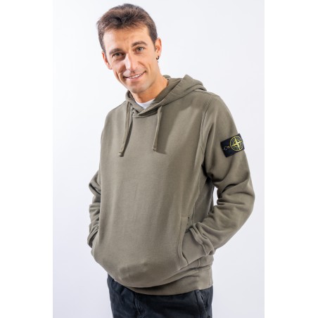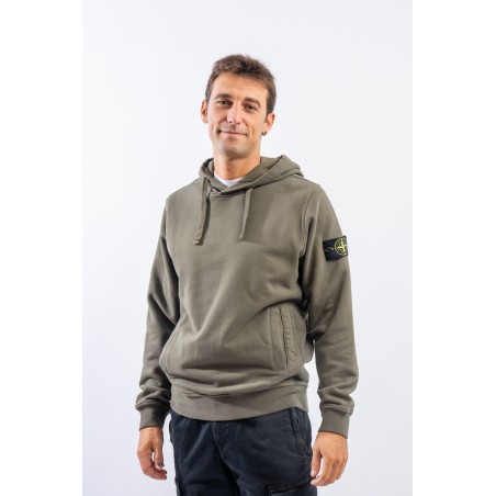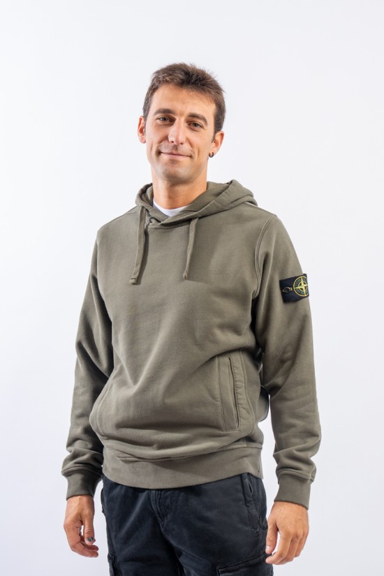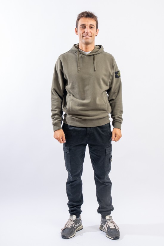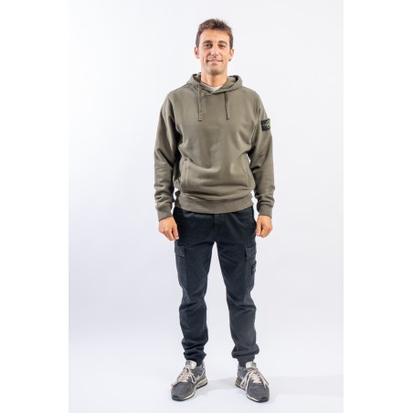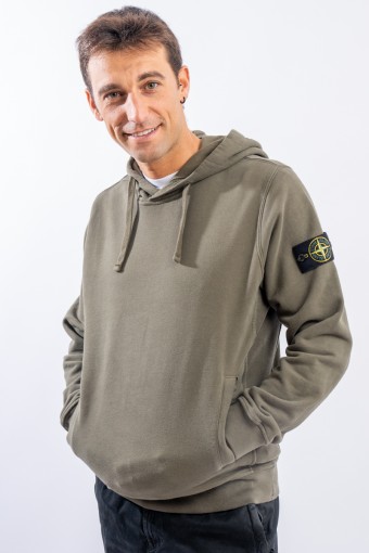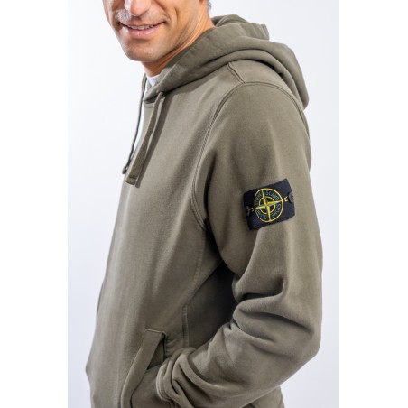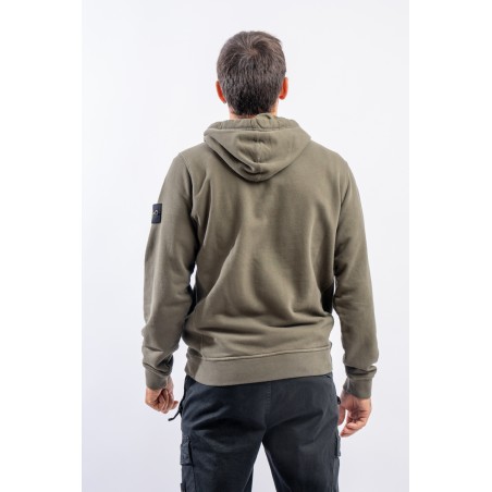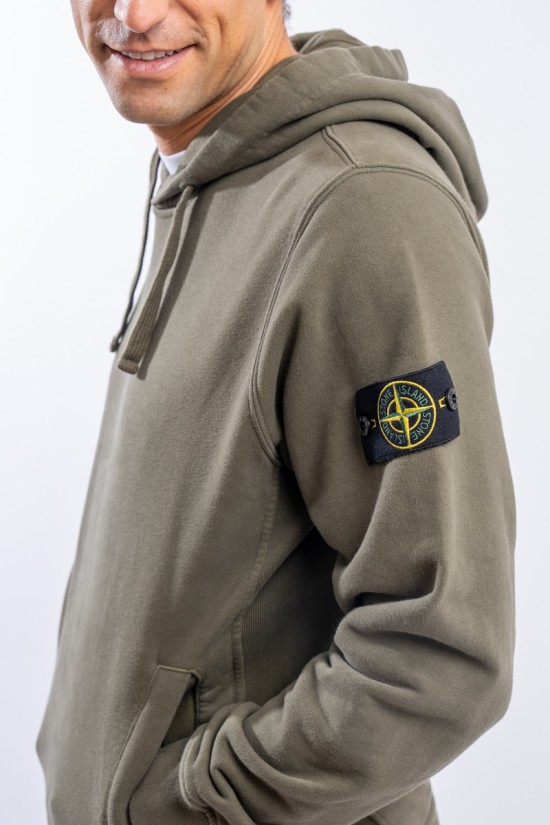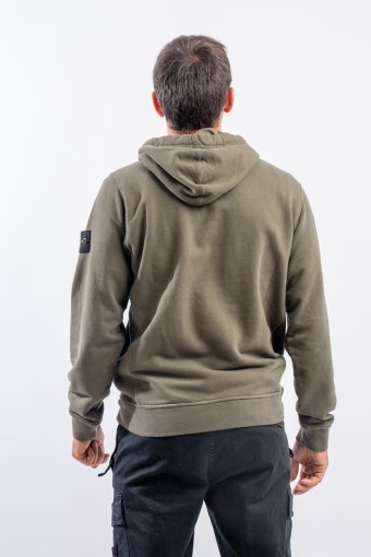 Organic cotton hooded sweatshirt. Brushed with double loop pocket and ribbed cuffs. Garment dyed.