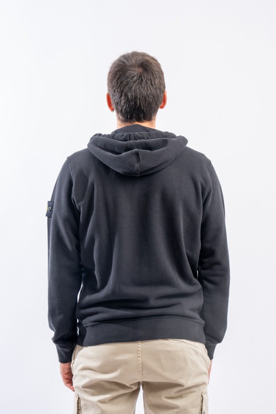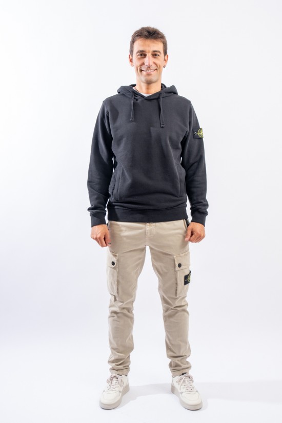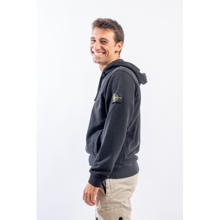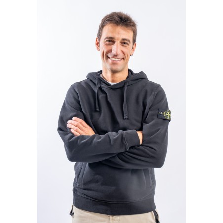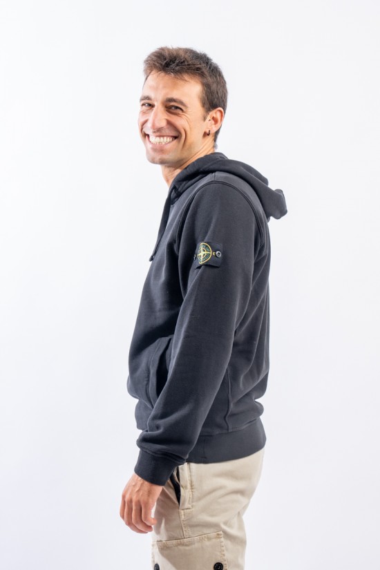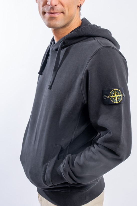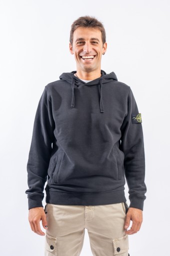 Organic cotton hooded sweatshirt. Brushed with double loop pocket and ribbed cuffs. Garment dyed.