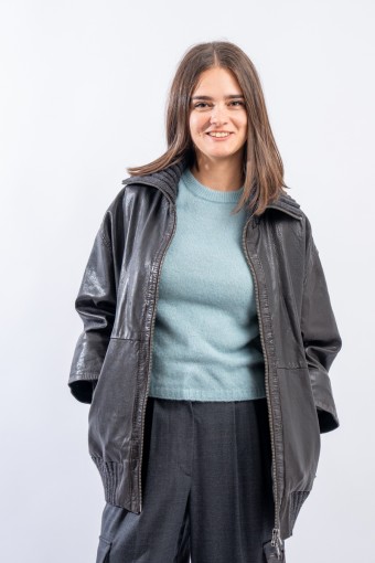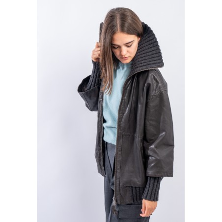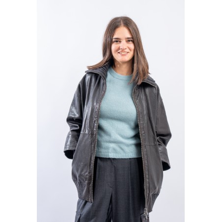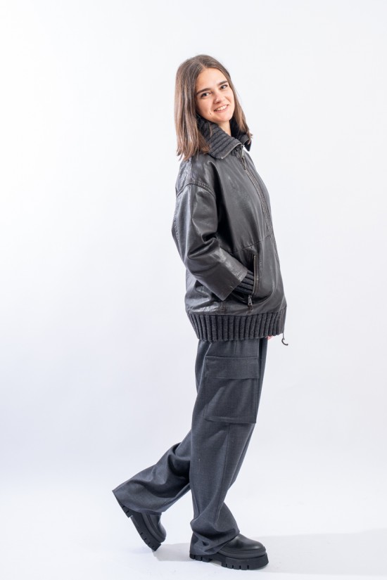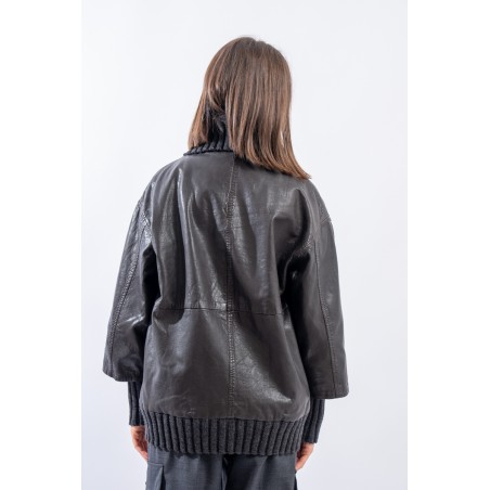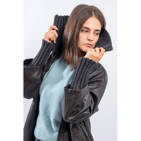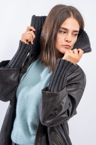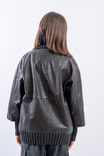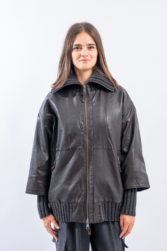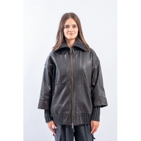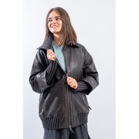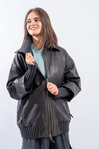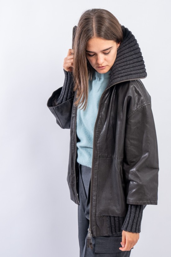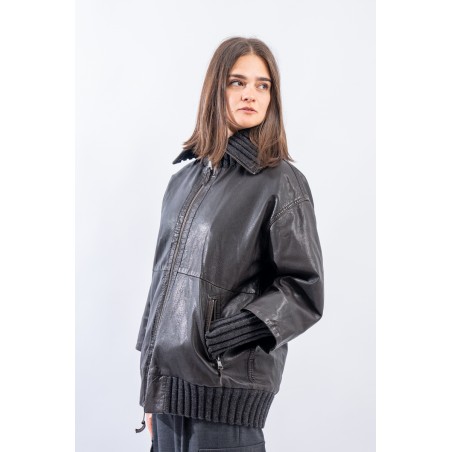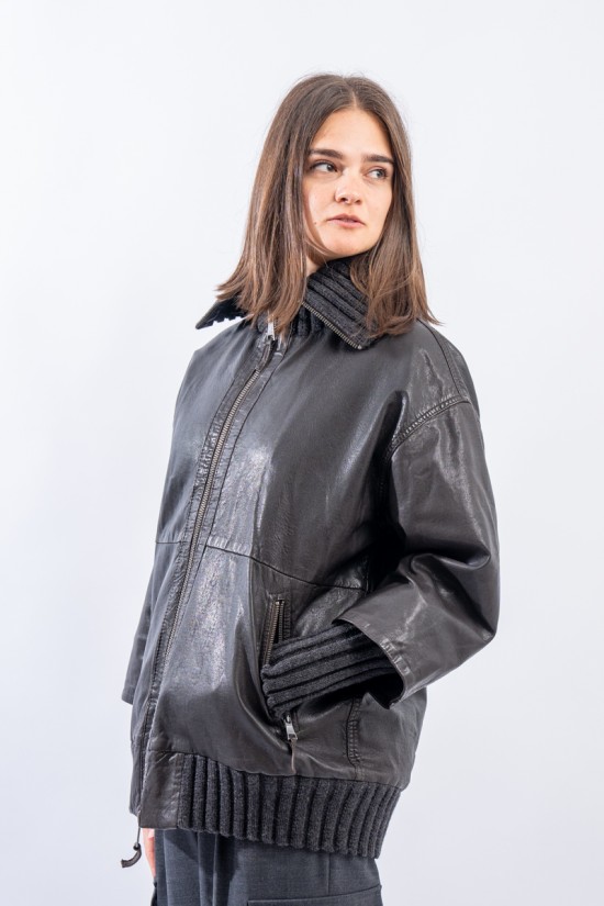 This washed leather jacket reinterprets the oversized bomber jacket. The garment is embellished with ribbed knit details. Made of fine-grained vegetable tanned leather with used treatment. Mid-over fit. Perfect for a metropolitan style!