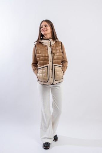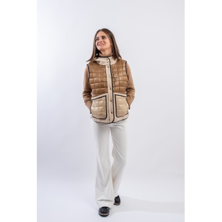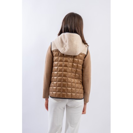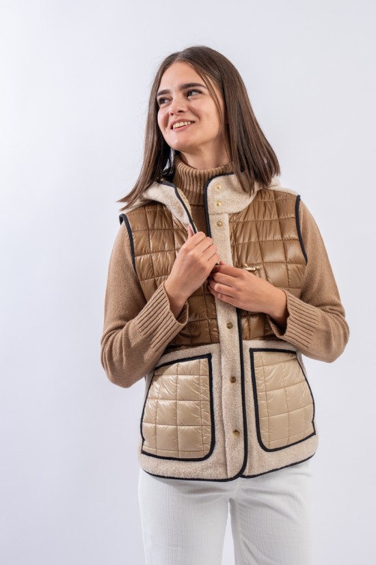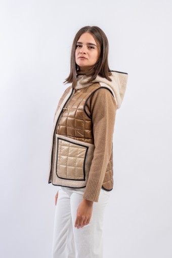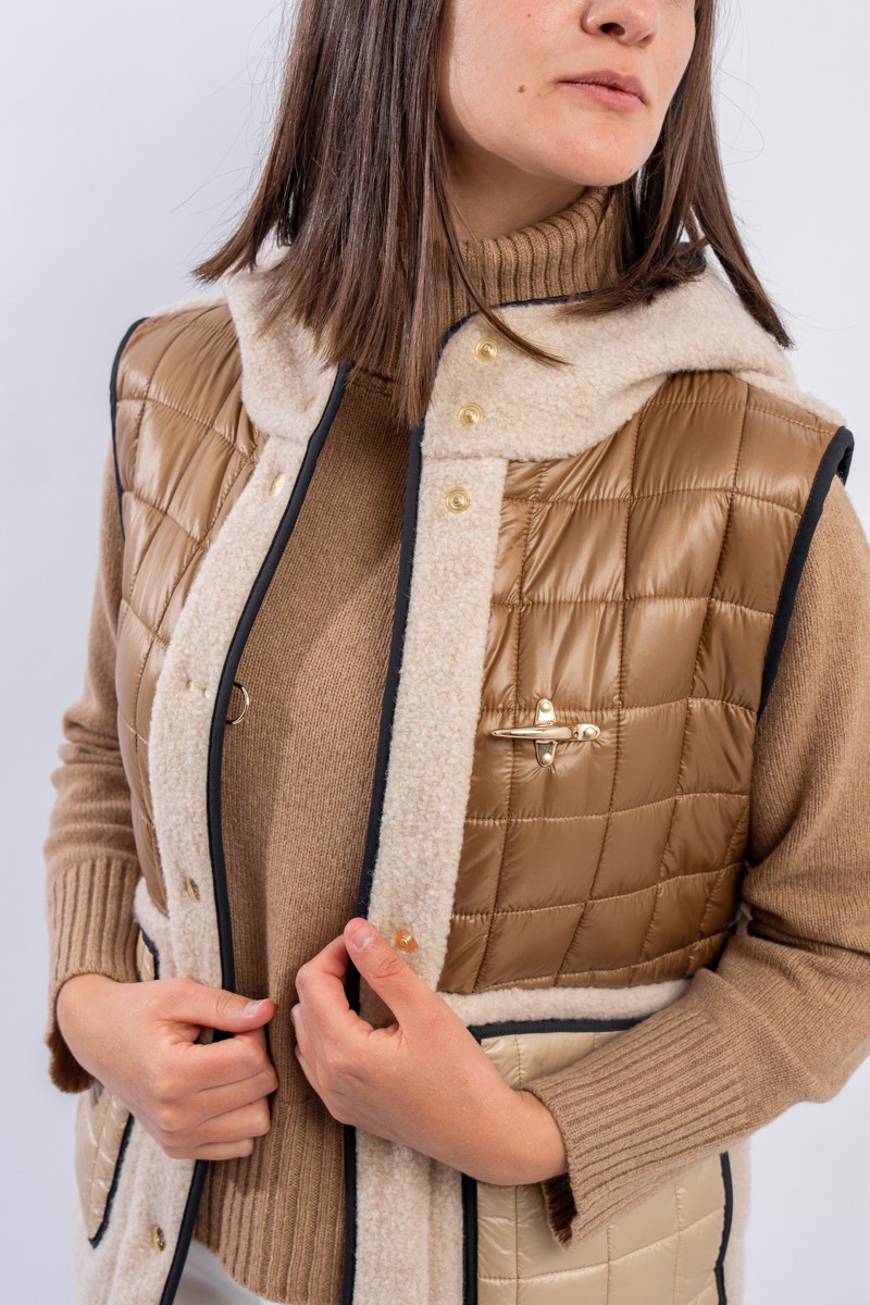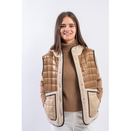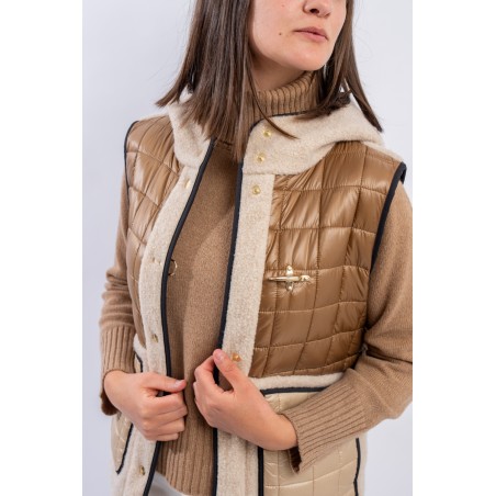 Vest embellished with shearling inserts and hood. Made of checked quilted technical fabric with wadding padding. Straight and rounded line on the bottom. Featuring custom snaps and iconic hook FAY closure. Large patch pockets with side opening.