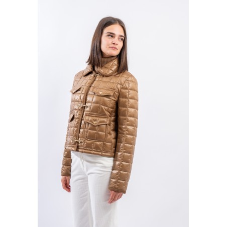 3-hook FAY jacket made of shiny technical fabric with checked quilting. The oversized collar is embellished with tone-on-tone velvet edging that continues along the lacing. Iconic FAY golden closure hooks and 4 flap pockets that refer to the workwear world.