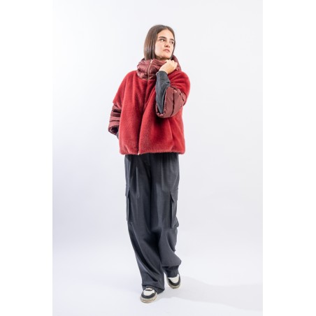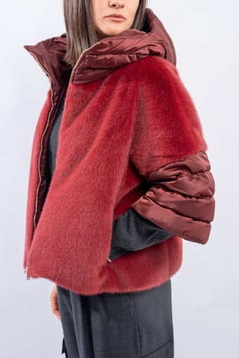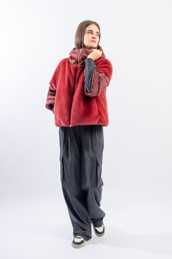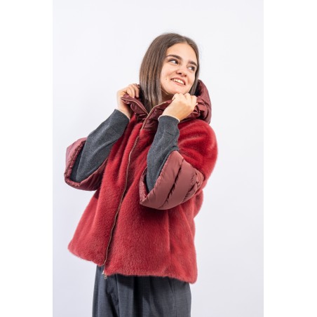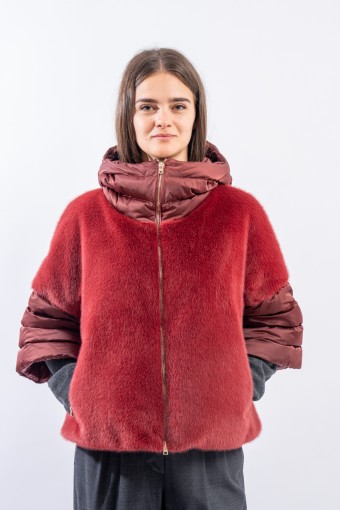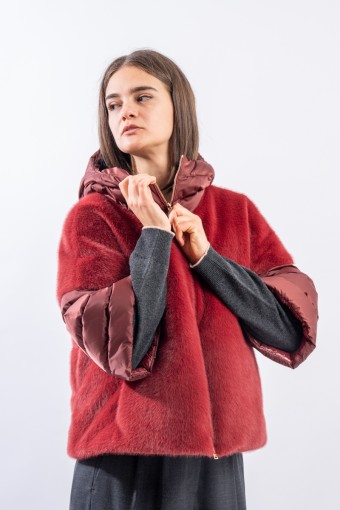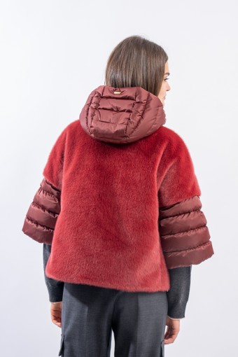 Shaped cape with short sleeves made of bi-material: hood and sleeves with quilted satin design, bust in soft faux fur. Regular fit, two-way gold zip closure and side pockets. Refined and feminine like a fur, warm and comfortable like a down jacket!