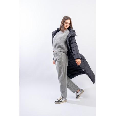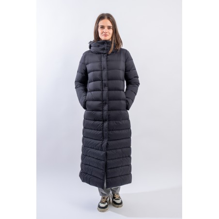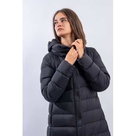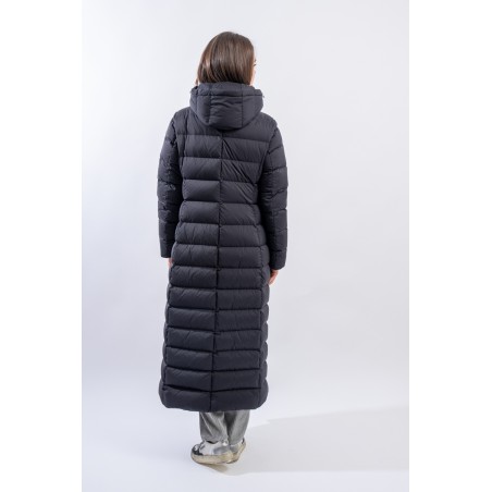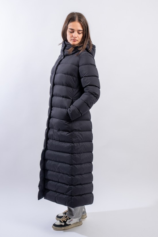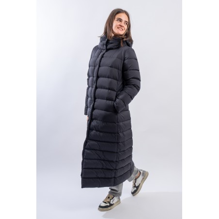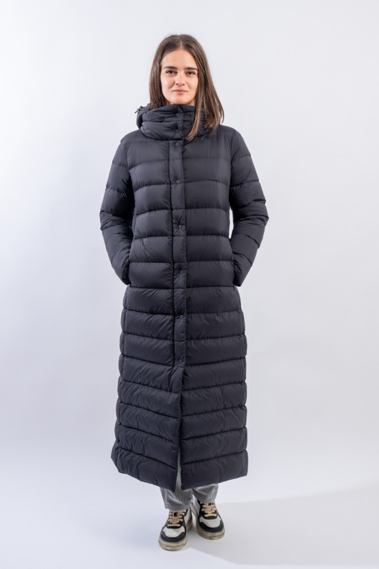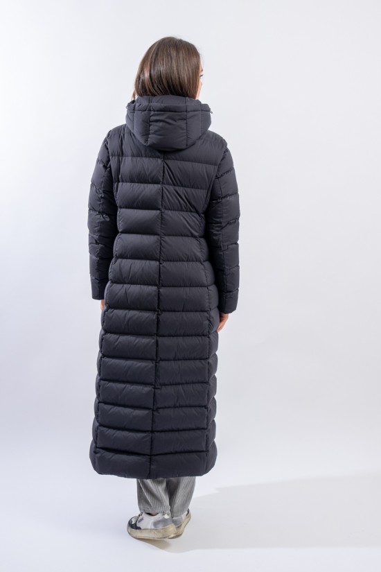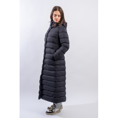 Long down jacket HERNO with an essential and screwed line. It is part of the new HERNO Globe Lab label, eco-friendly and innovative, which combines lightness and performance with a sustainable soul. The very light goose down padding combined with the length of the garment guarantees exceptional thermal insulation. Crater collar with detachable hood, side pockets closed by thin invisible zips.