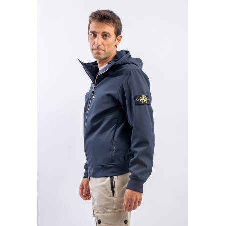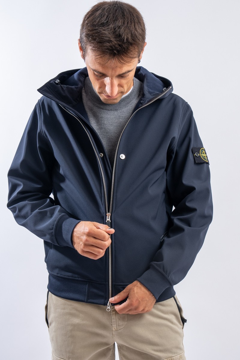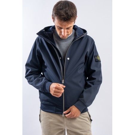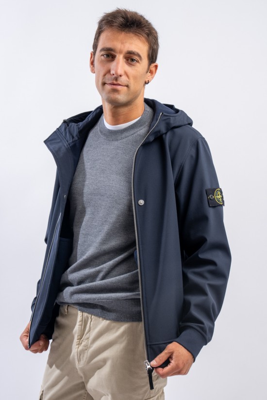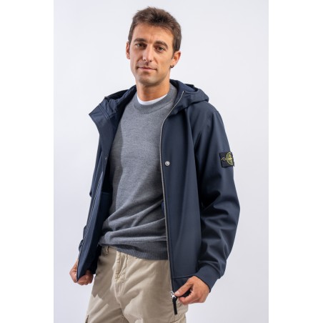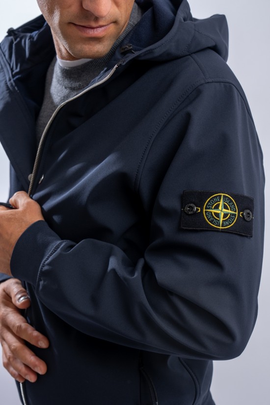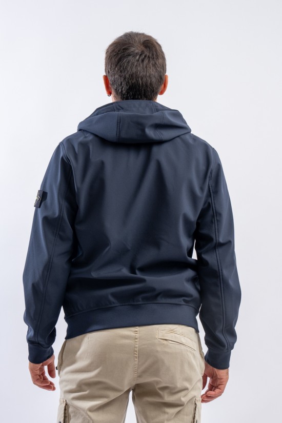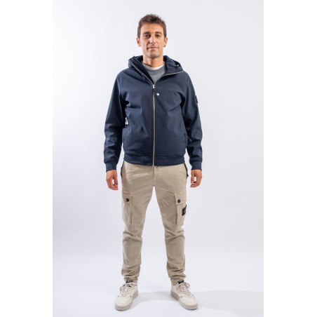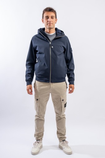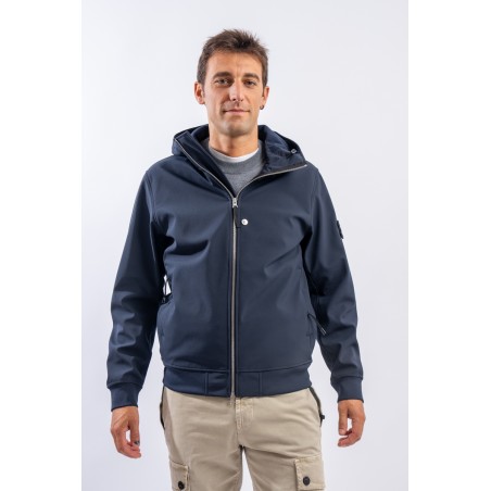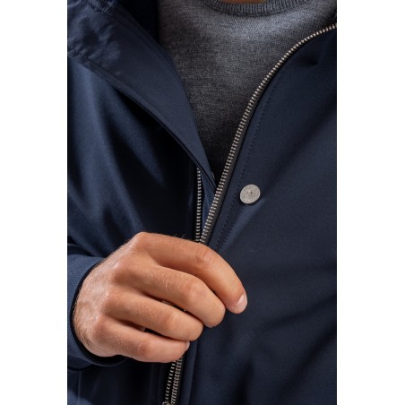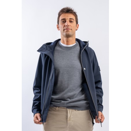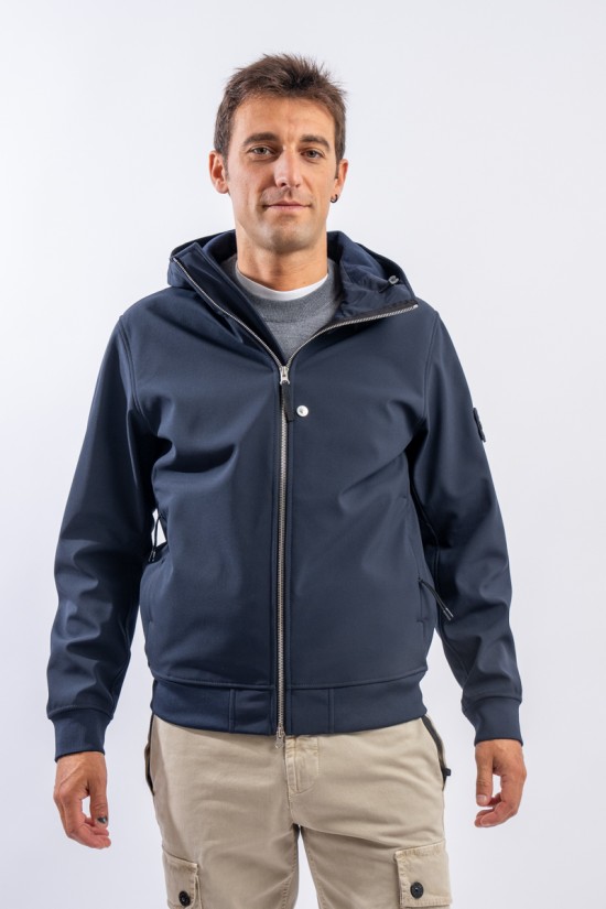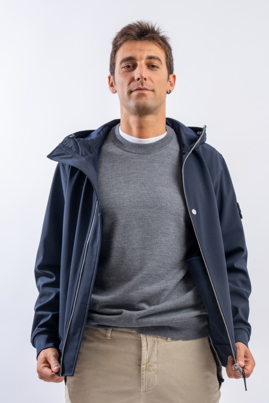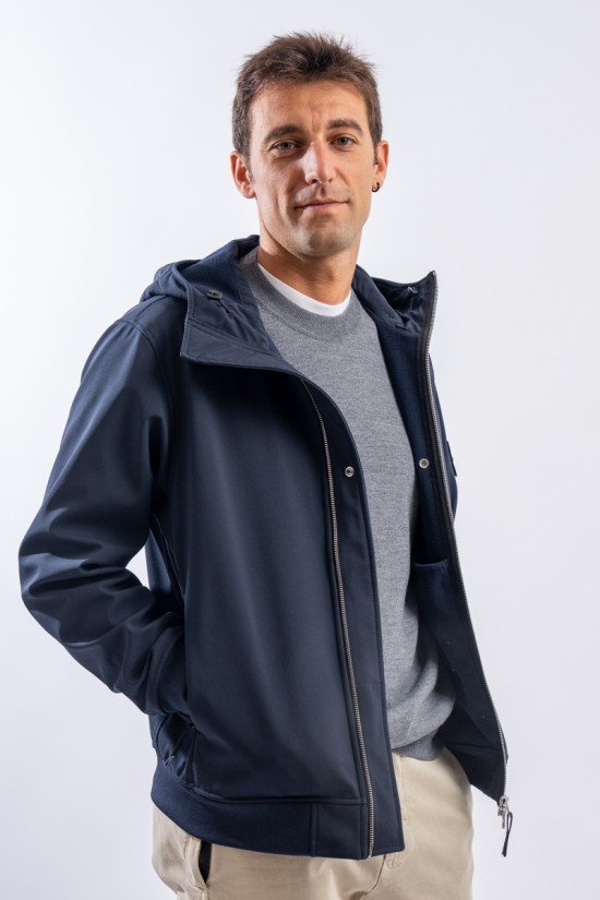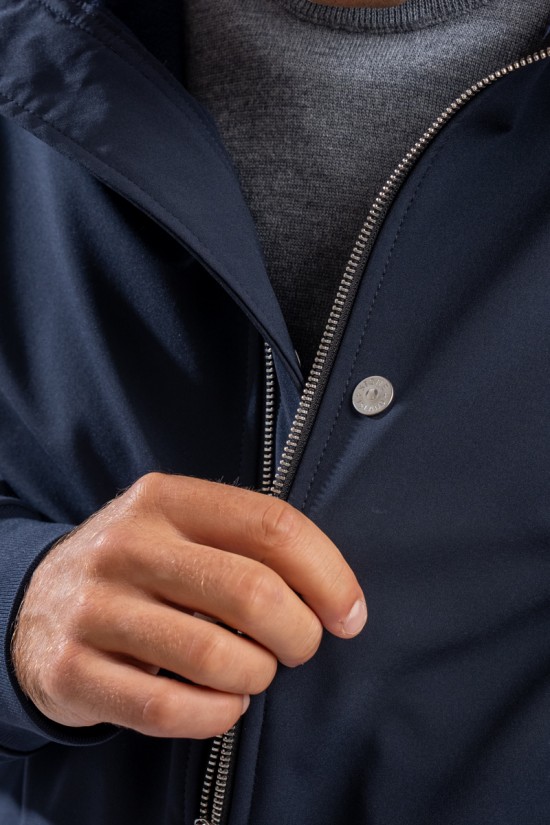 Timeless soft shell jacket with hood. Fabric coupled with membrane, it offers hypermeability standards up to 8000 mm/24h. Lightweight and wind-resistant, practical and useful in everyday metropolitan life. Iconic!