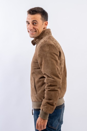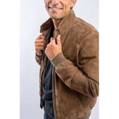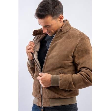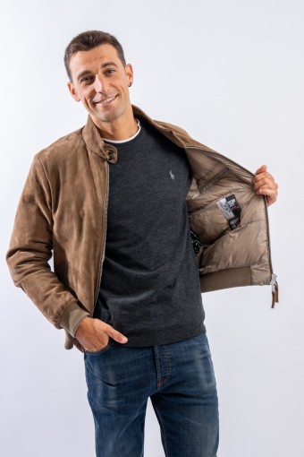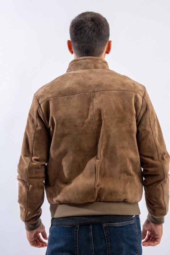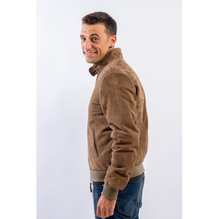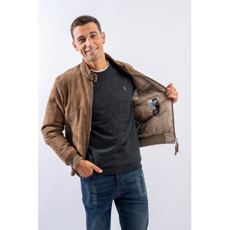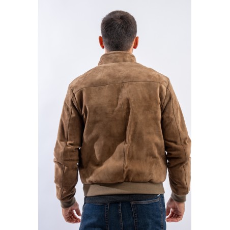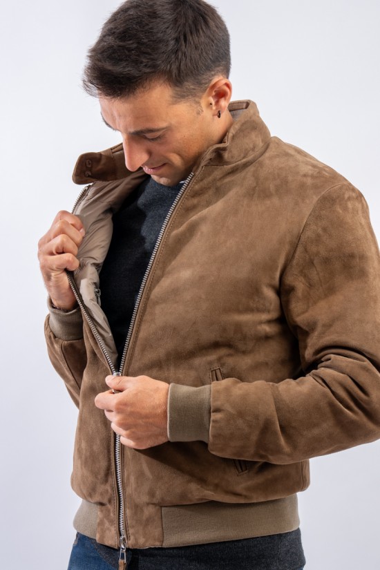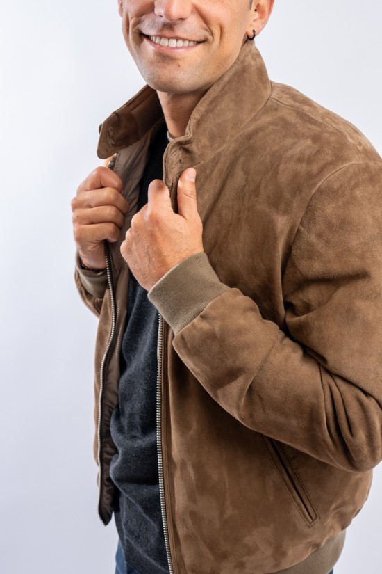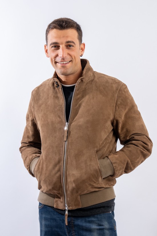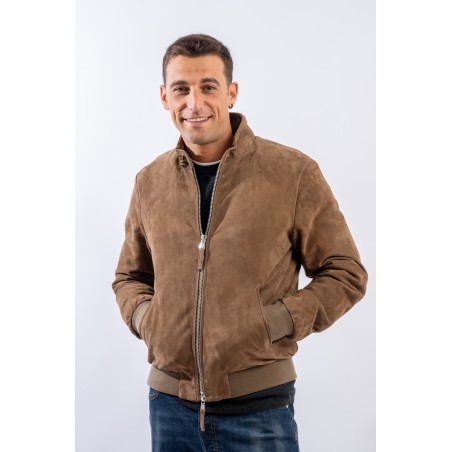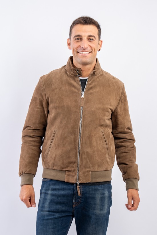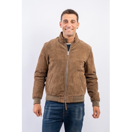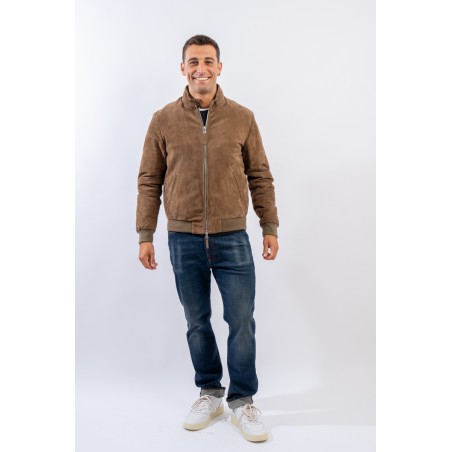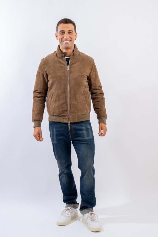 Leather jacket by THE JACK LEATHERS Elvis Winter Suede model, in soft brown suede, is a versatile and refined garment. Designed for the man looking for style and comfort, this jacket features a padded lining with nylon down, ideal for colder days. The front zip, together with the elastic waistbands and cuffs, ensures a snug and personalized fit. The classic design is combined with modern details, making it perfect for both casual and dressier looks. A quality, resistant and fascinating garment, which combines style and functionality in a single, irresistible product.