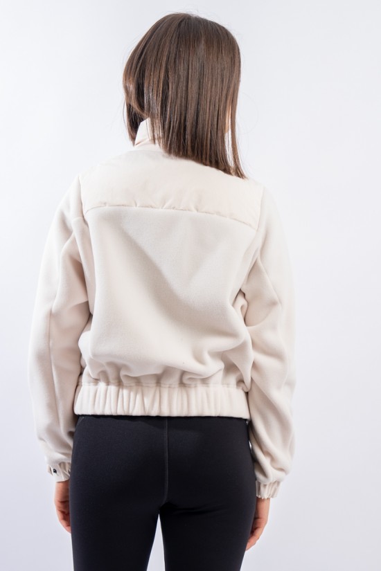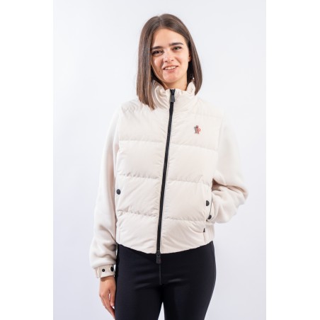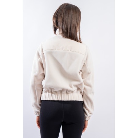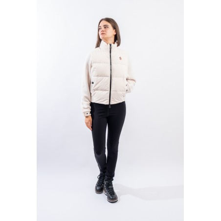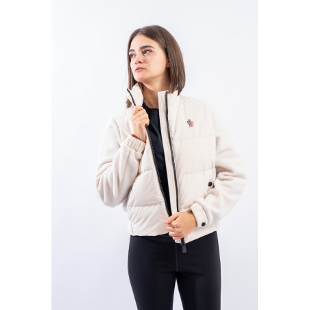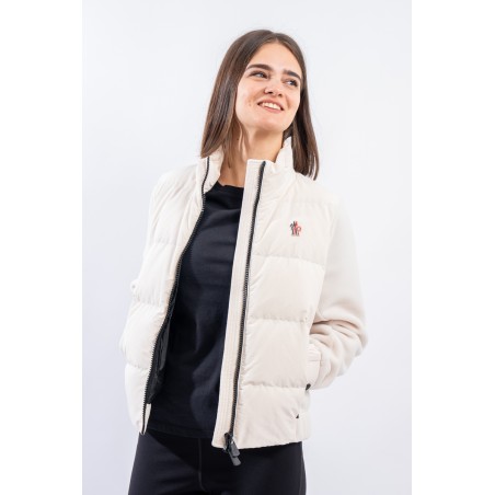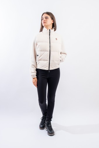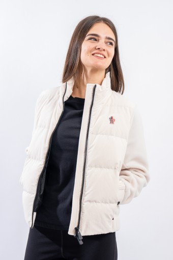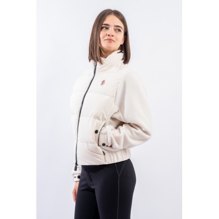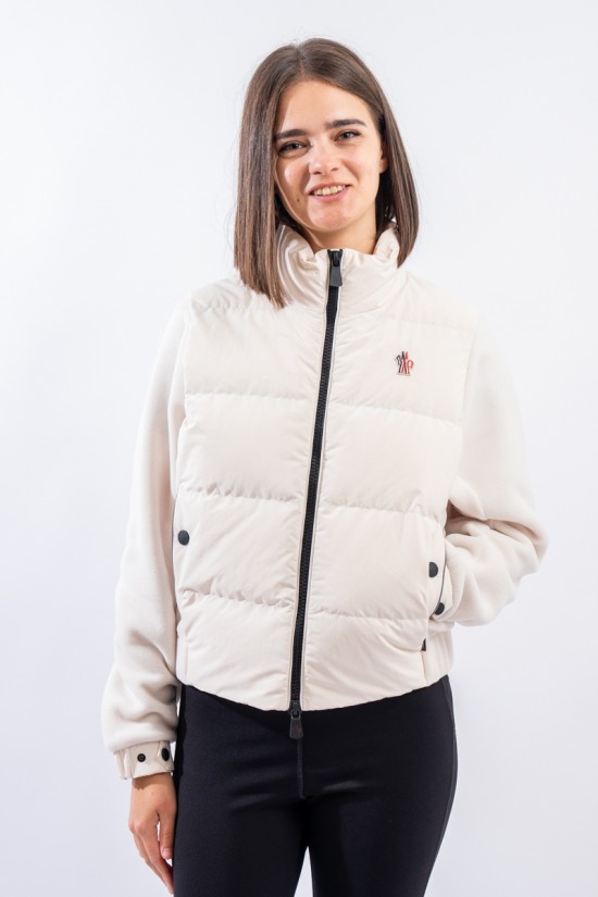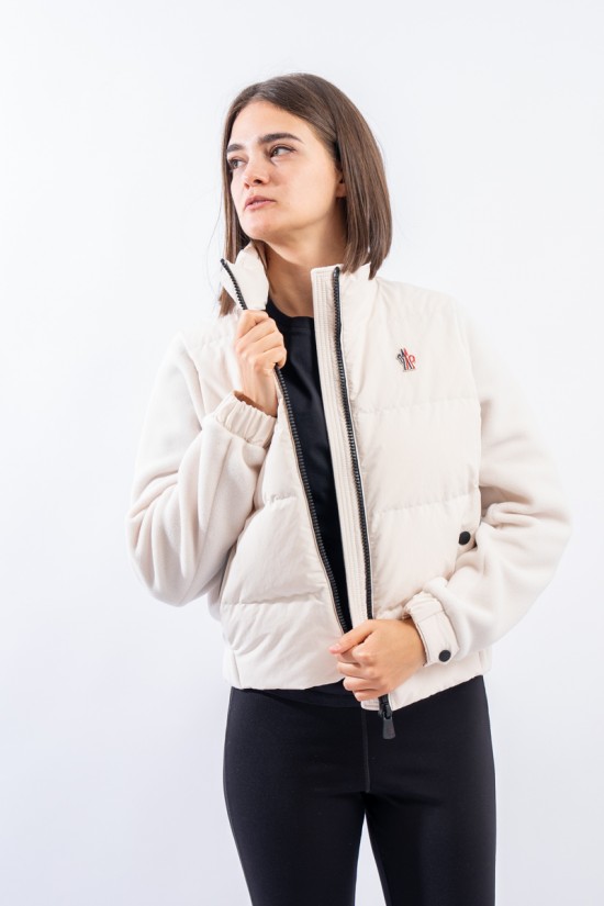 Bomber jacket made of bi-material: nylon with fine down padding on the front and shaved stretch fleece on the sleeves and back. External quilting in matte nylon with contrasting color zip. Wraparound stand-up collar and side pockets closed by logo button. Perfect to wear alone or as a second layer, it will add a touch of style to any of your outfits!