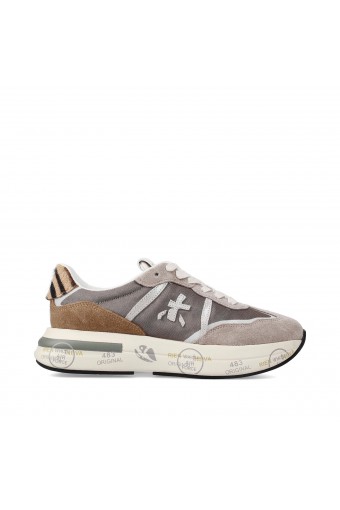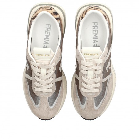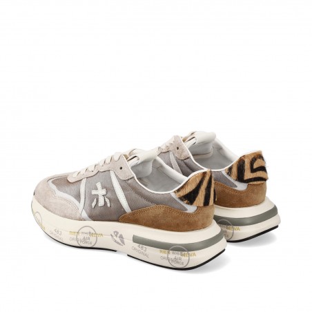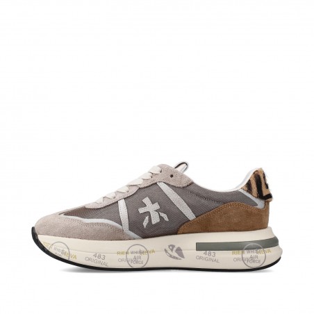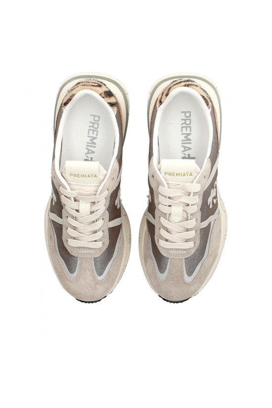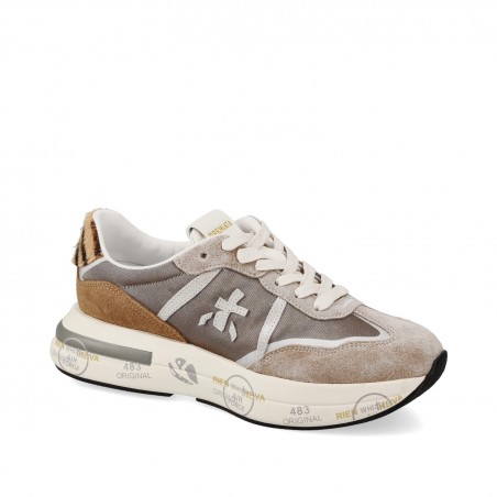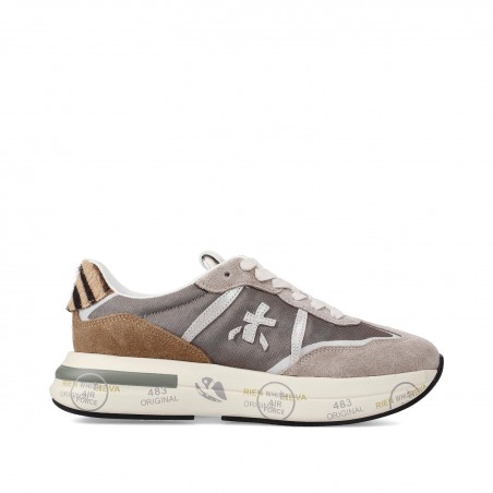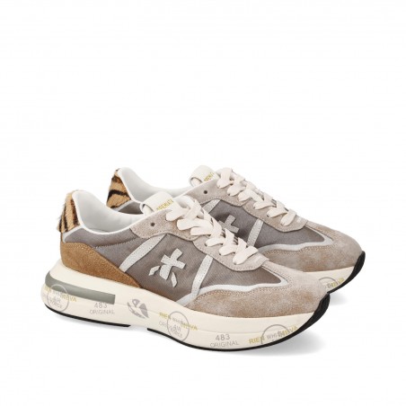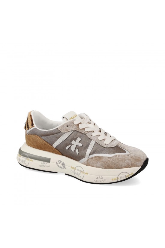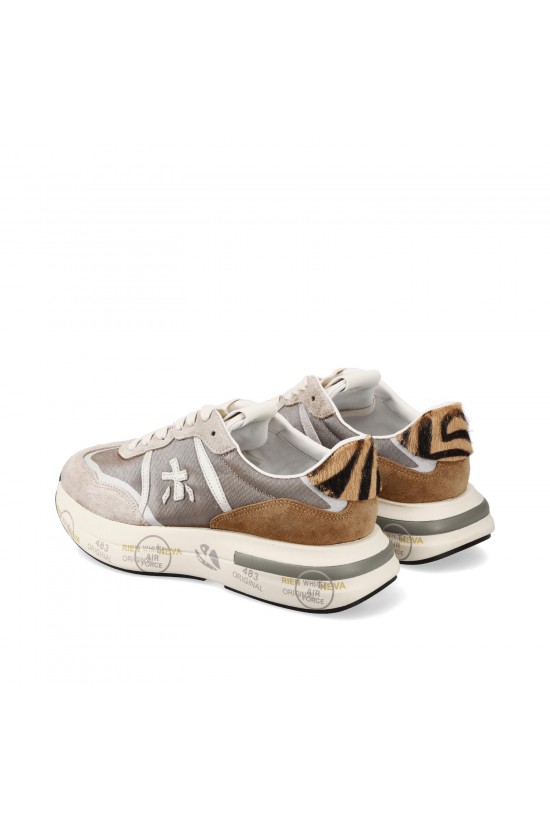 The Cassie 7675 shoe from PREMIATA combines style and comfort in a modern and elegant design. Inspired by the 70s, these sneakers mix retro and contemporary elements. Made of mesh fabric with suede details, embellished with an animal print pony skin heel. The ergonomic and super light sole, with the iconic PREMIATA lettering, guarantees a pleasant walk, while the high quality materials ensure durability and resistance. The PREMIATA logo on the side, tongue and sole highlights the elegance of this model. Perfect for any occasion, they easily adapt to casual or more refined looks, making them a must-have for those who love contemporary fashion.