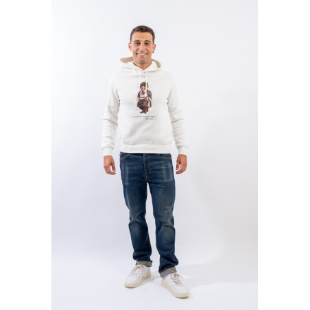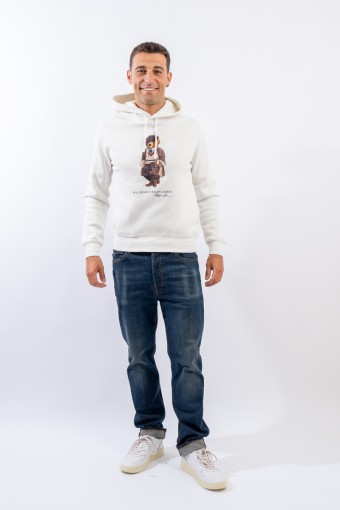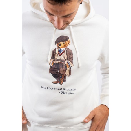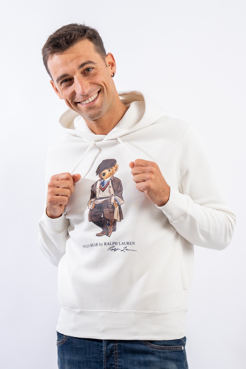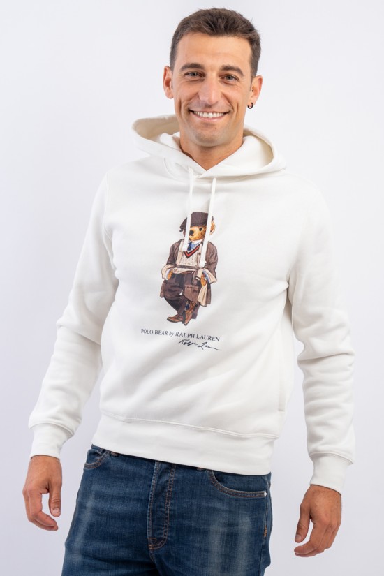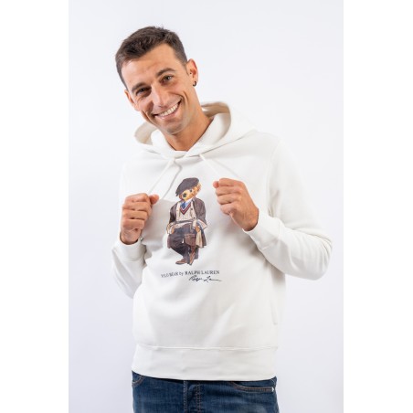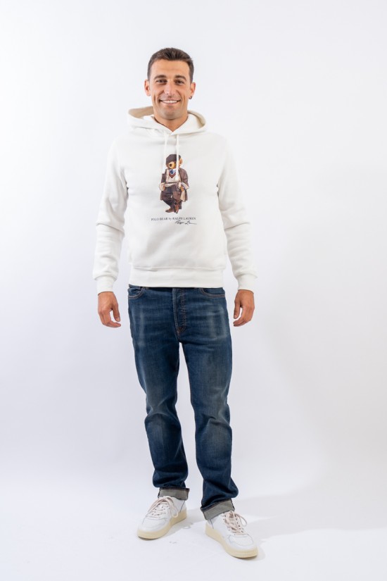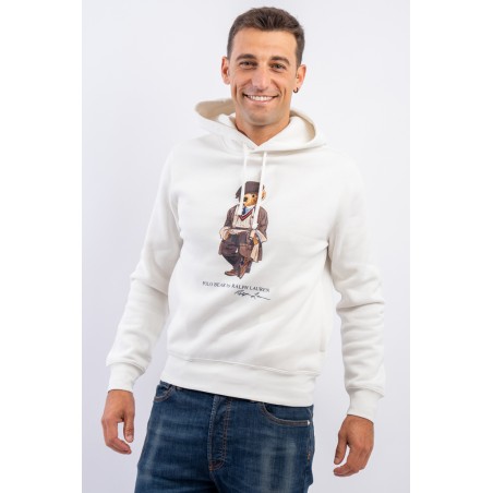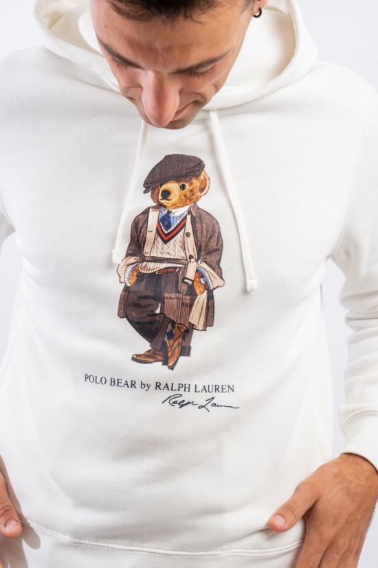 Soft hooded sweatshirt by POLO RALPH LAUREN, made of a fine cotton blend that guarantees comfort and resistance. It features a double pocket pass-through on the front, elasticated ribbed cuffs and hem, ensuring a snug fit and an impeccable silhouette. The front is distinguished by the iconic Polo Bear, symbol of the brand, accompanied by the words "Polo Bear by RALPH LAUREN" and "RALPH LAUREN", which give a touch of elegance and recognizability. Perfect for a casual look, this sweatshirt is ideal for any occasion, offering style without sacrificing comfort. A versatile garment that combines tradition and modernity.