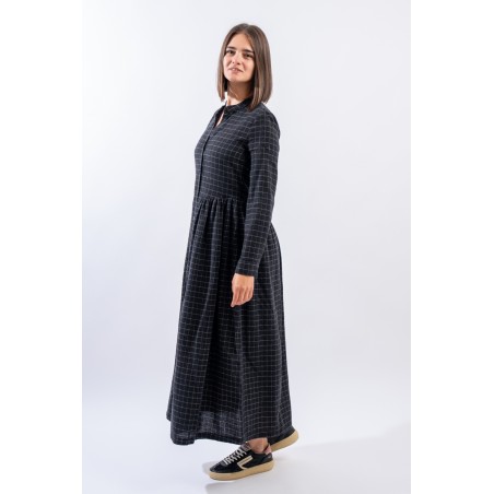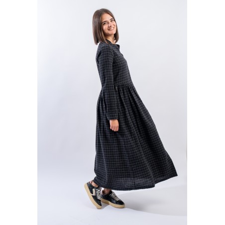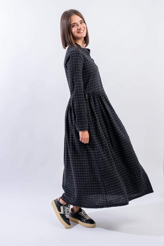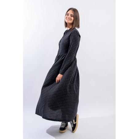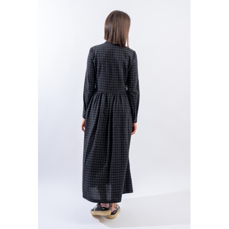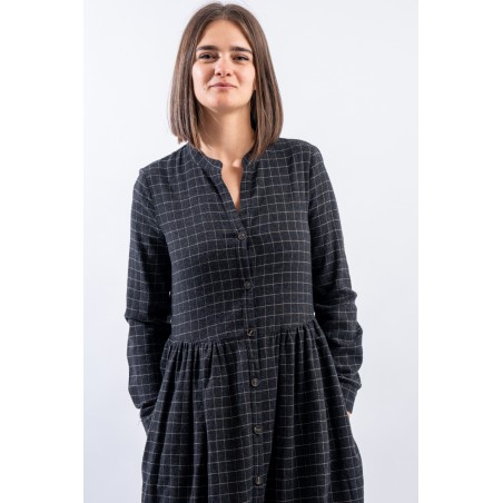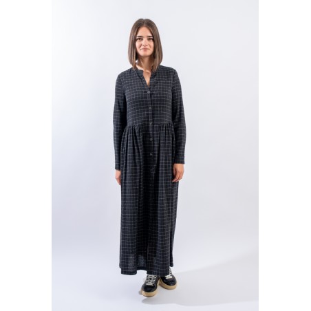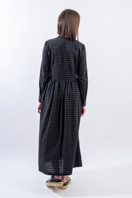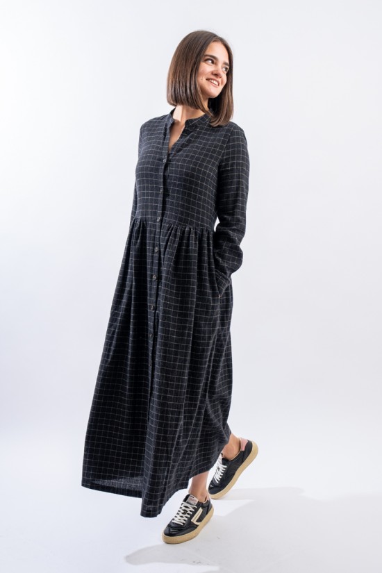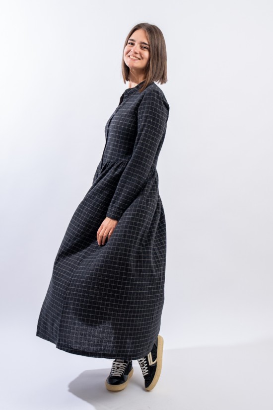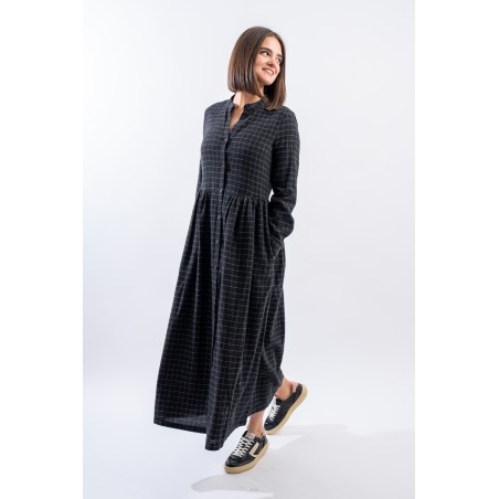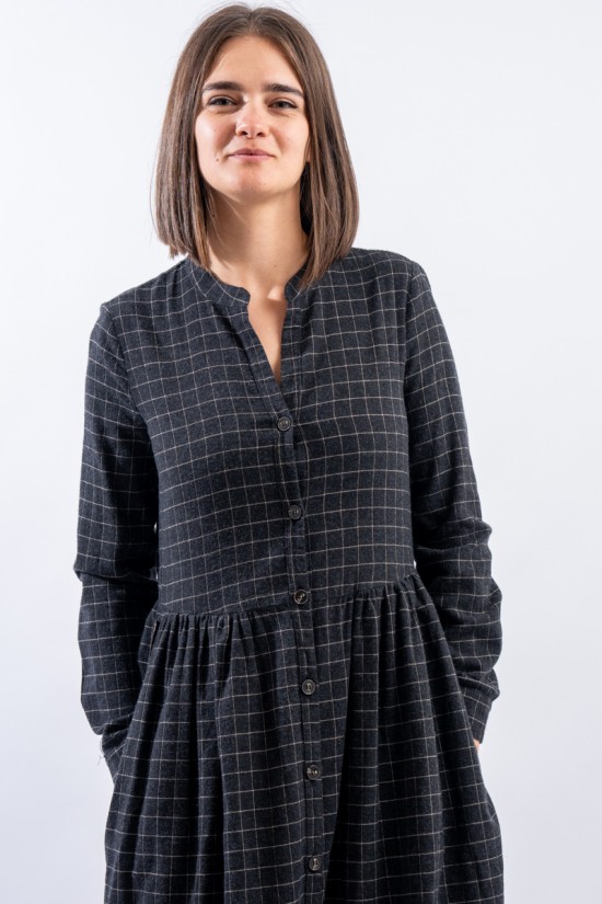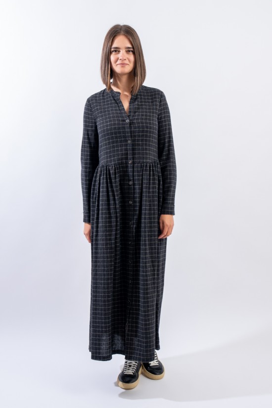 Long dress made of soft cotton flannel with refined check all over print. Open collar with slight V-neck and button closure. Waist embellished with small gathers that create volume and define the silhouette. Long sleeves finished with shirt cuff.