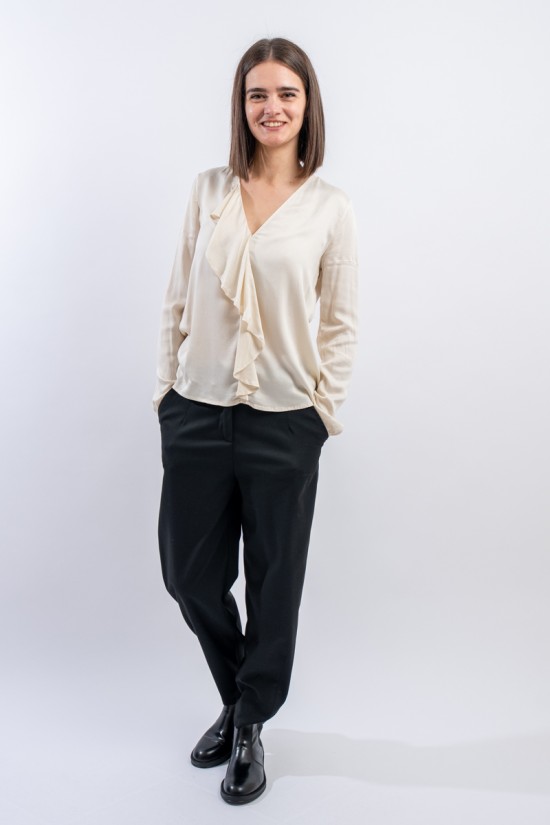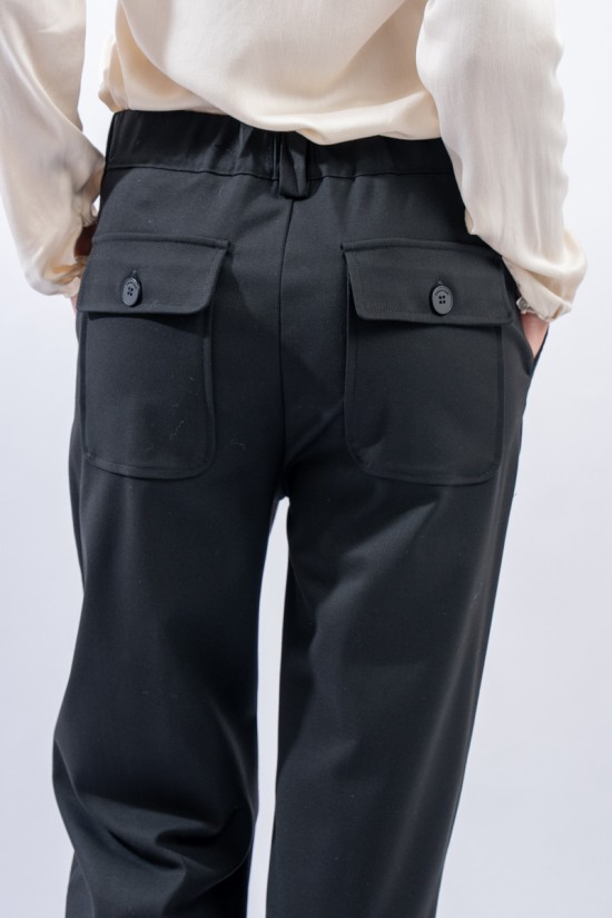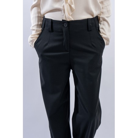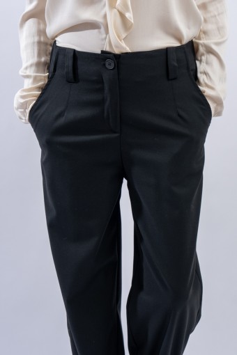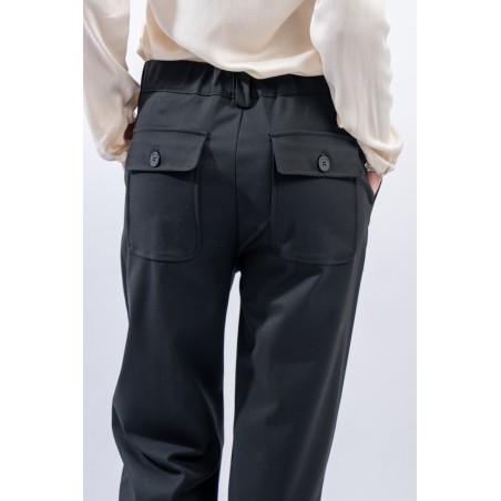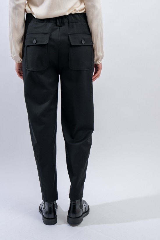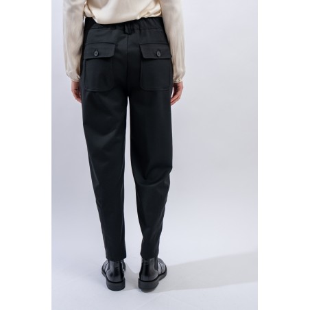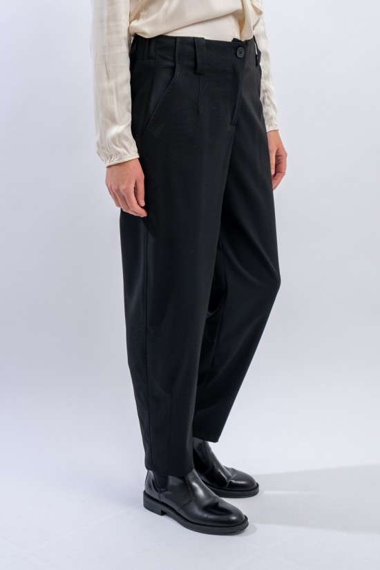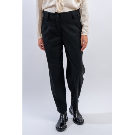Alessia Santi trousers with a refined and elegant cut. The fit on the leg is wide and then slightly tightens at the bottom. This balloon effect is strongly part of the new trends of the autumn season. It features a high waist with an elastic insert on the back, button and zip closure. It features two large pockets on the back with flap and button. Made in Italy.