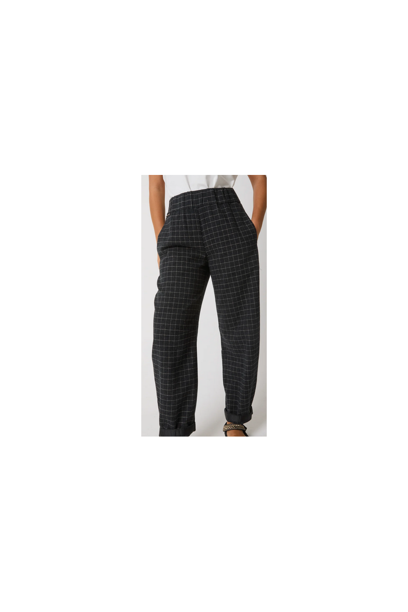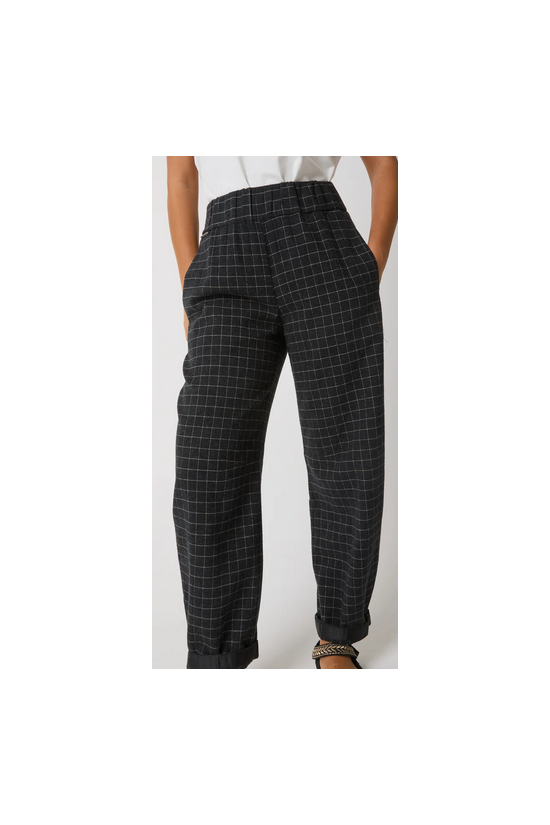 Comfort trousers with elasticated waistband made of soft cotton-blend flannel with an all-over check pattern. It has French pockets and turn-up at the bottom. Relaxed fit for metropolitan elegance that combines comfort and style.
