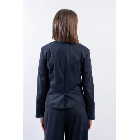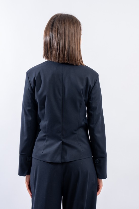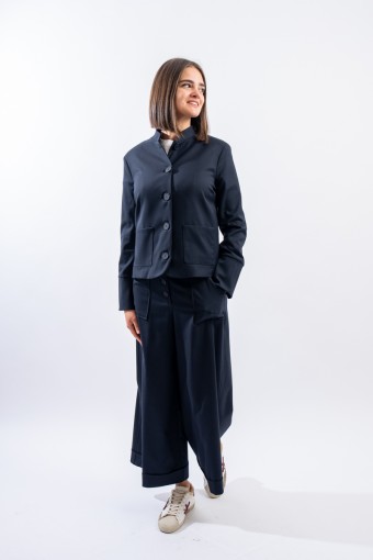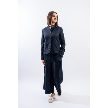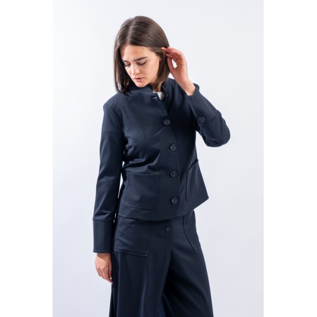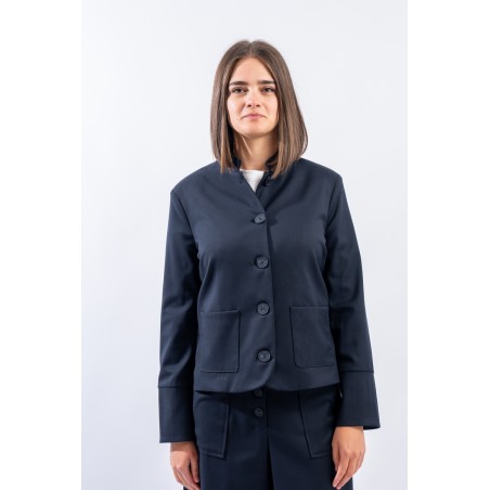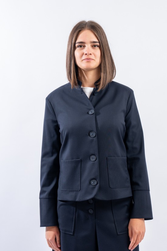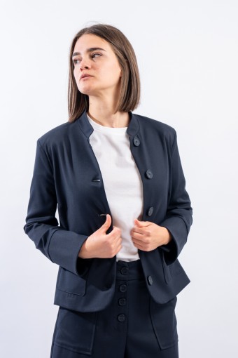 Elegant designer ALESSIA SANTI jacket made of stretch viscose. Finished with a mandarin collar and refined slits on the cuffs with a logo button. Front patch pockets and button closure. Combined with matching trousers and a top, it creates a sophisticated and feminine total look.