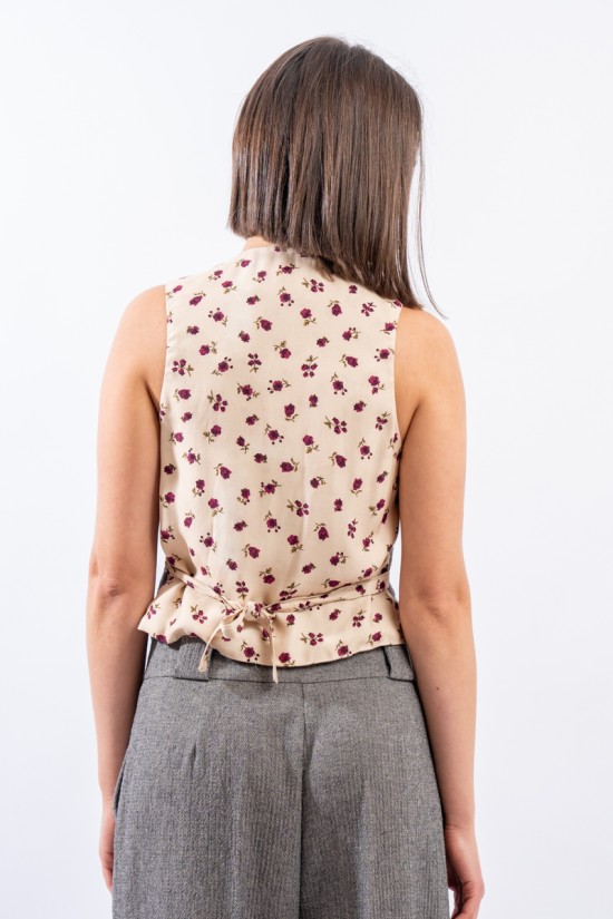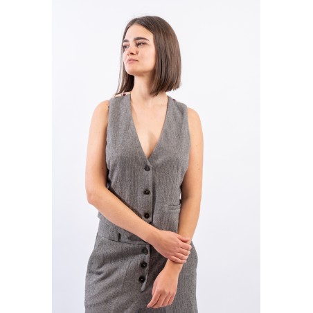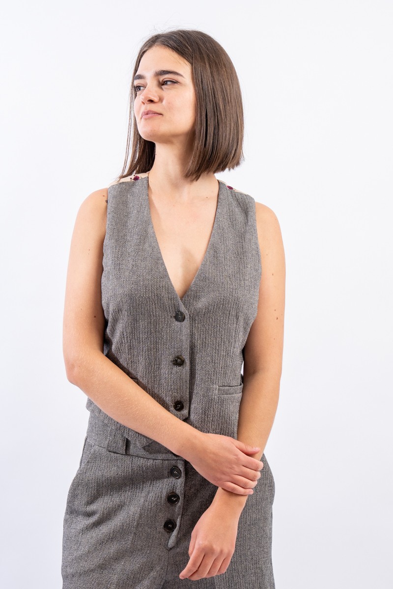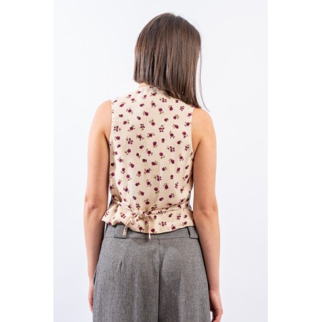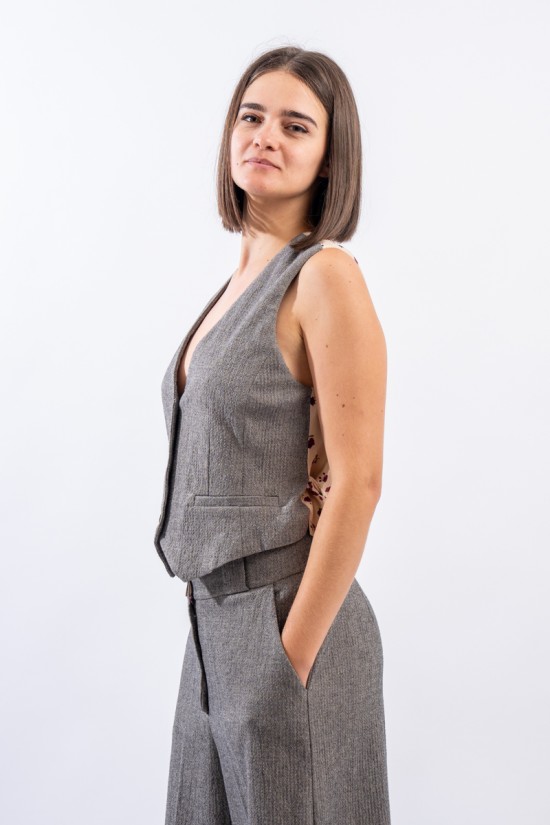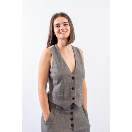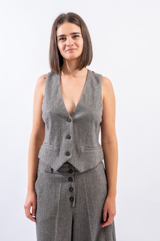 Vest with a tailored design made of stretch cotton blend tweed. It features a V-neckline, welt pockets and button closure. Embellished on the back with a viscose insert with a delicate floral pattern. Feminine and sophisticated, perfect to coordinate with her trousers in the same texture.
