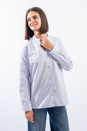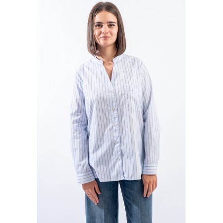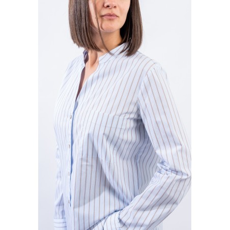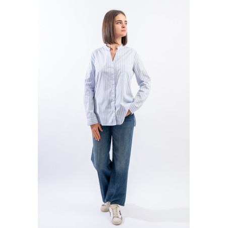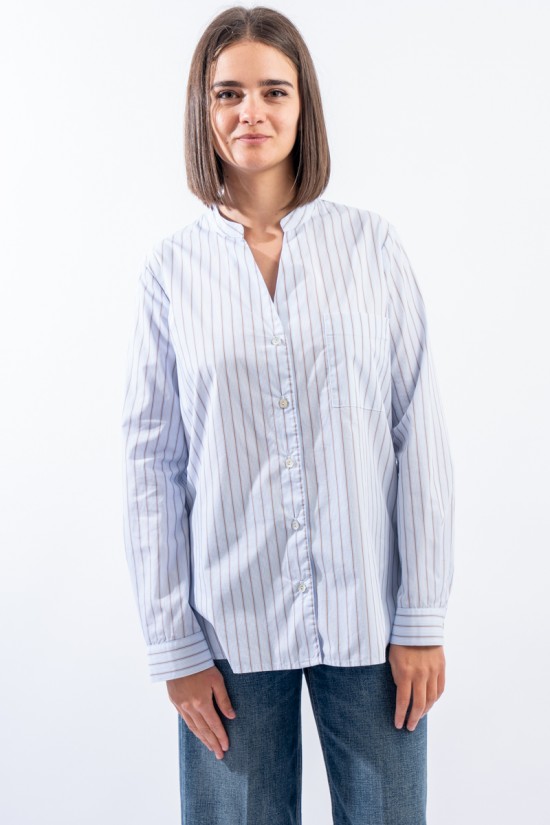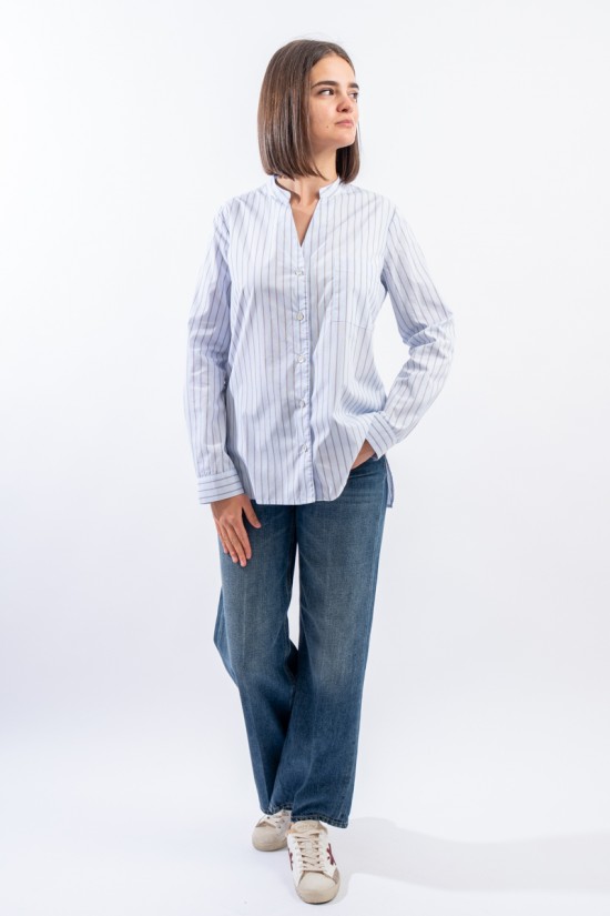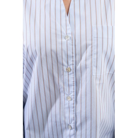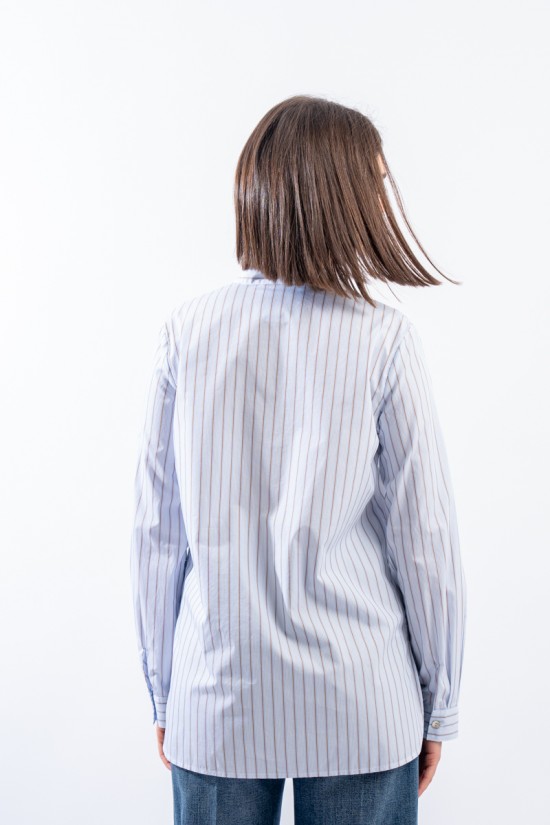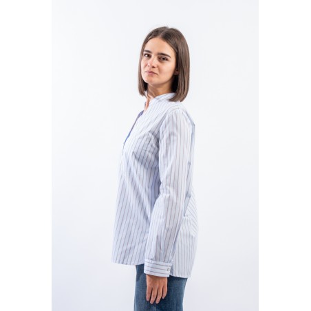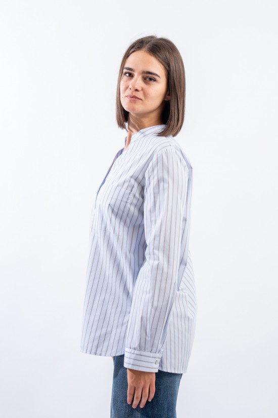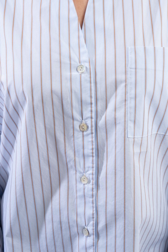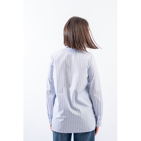 Relaxed-fit shirt in stretch cotton poplin with a refined stick motif. It features a collar and a slight V-neckline, a patch pocket on the chest and side slits. Closure with logo buttons and shirt cuffs.
