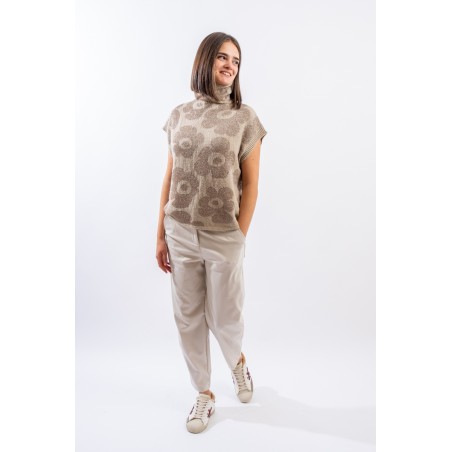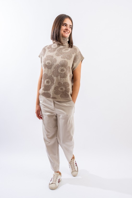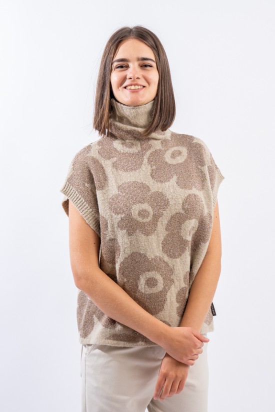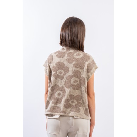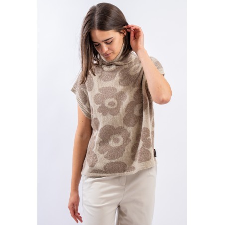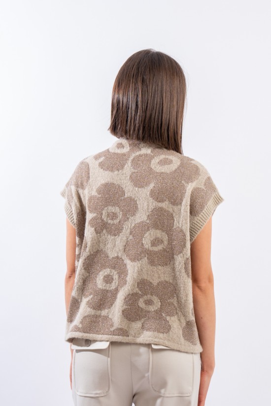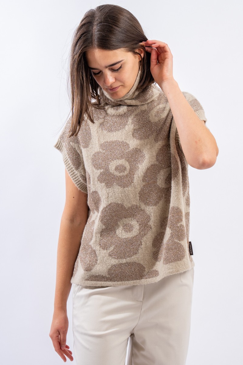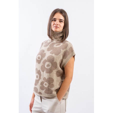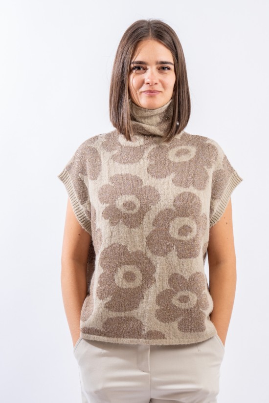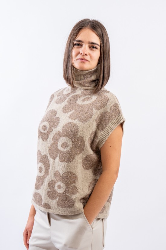 Boxy-cut sleeveless turtleneck sweater made of a soft alpaca and wool blend yarn. The tone-on-tone jacquard floral motif with lurex details embellishes the garment and gives a refined brightness. Made in Italy.