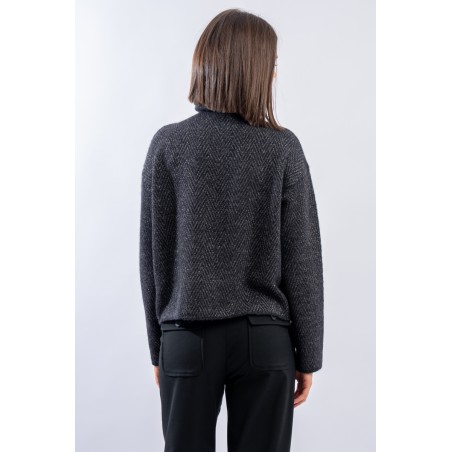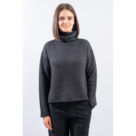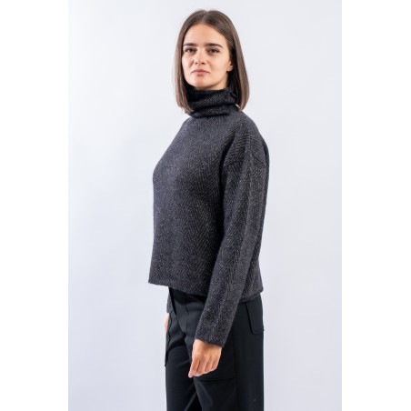 Boxy-cut turtleneck sweater made of a soft viscose and alpaca blend yarn. The herringbone motif in lurex embellishes the garment and gives a refined brightness. Long sleeve and dropped shoulder, regular fit. Made in Italy.
