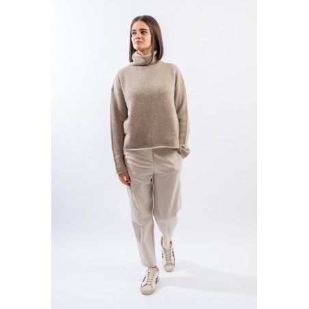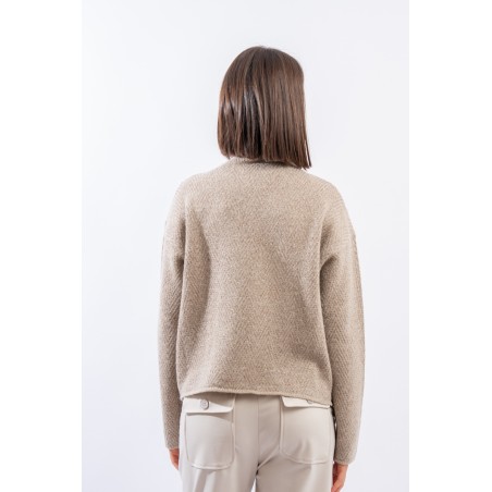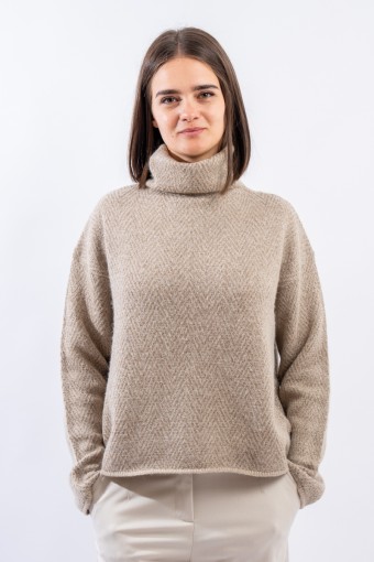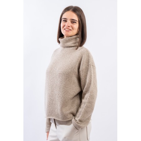 Boxy-cut turtleneck sweater made of a soft viscose and alpaca blend yarn. The herringbone motif in lurex embellishes the garment and gives a refined brightness. Long sleeve and dropped shoulder, regular fit. Made in Italy.