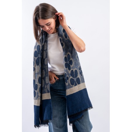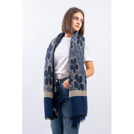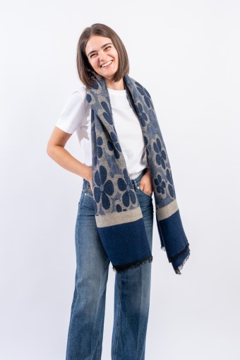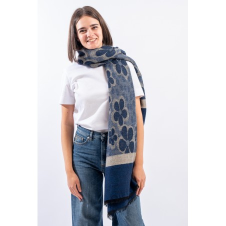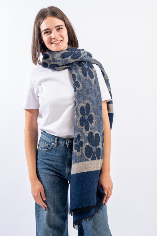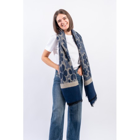 The maxi patterned scarf with frayed details at the ends, signed ALESSIA SANTI, offers a touch of originality and can be an ideal complement to different outfits. The large size makes it very versatile, so you can wear it in various ways, perhaps wrapped around the neck or as a shoulder cover on cooler days.