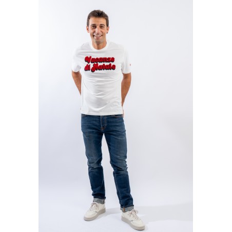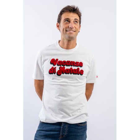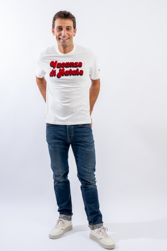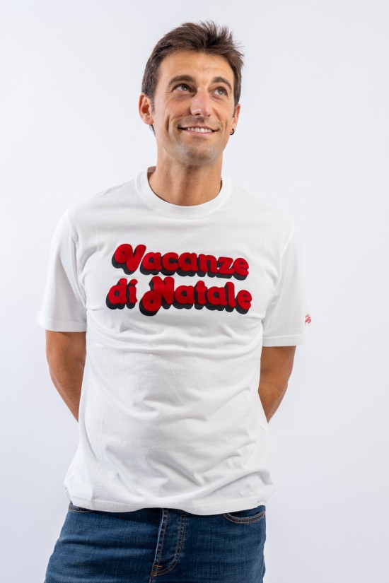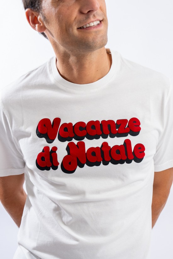 Crewneck T-shirt made of 100% organic cotton. Characterized by the contrasting velvet-effect "Christmas holidays" lettering. Finished with a ribbed knit on the neckline. Regular fit.