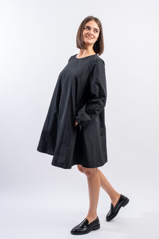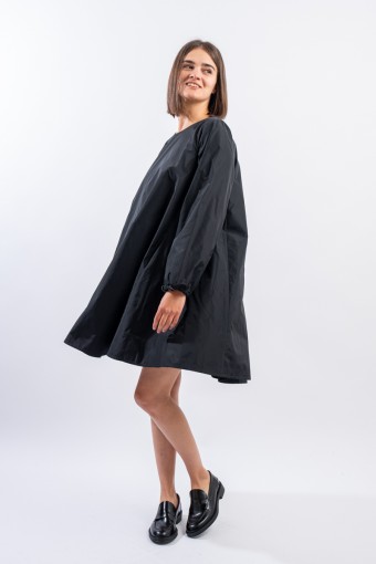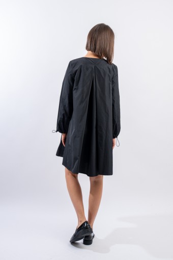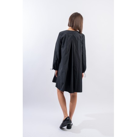Niu short A-line dress made of taffeta, feminine and refined! It features a wide crew neck, adjustable drawstring cuffs and welt pockets. The flap on the back creates volume and movement!