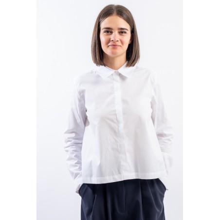 Stretch cotton poplin blouse. It features a shirt collar and cuffs. Embellished on the back with pleats that create movement and give volume. Delicious and refined, not the usual white shirt!