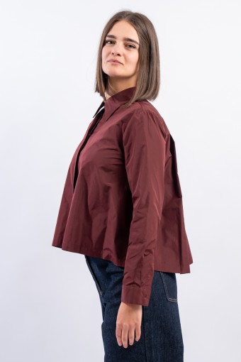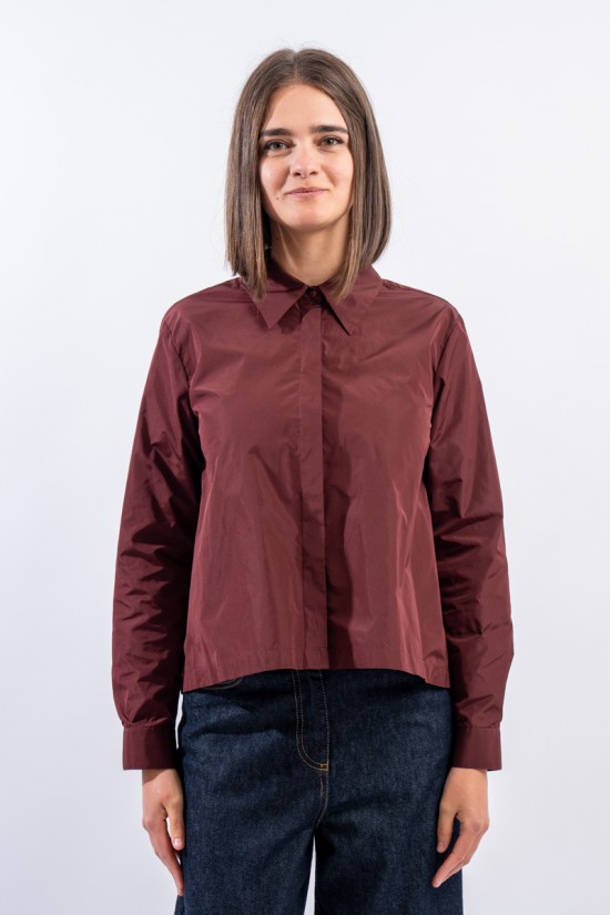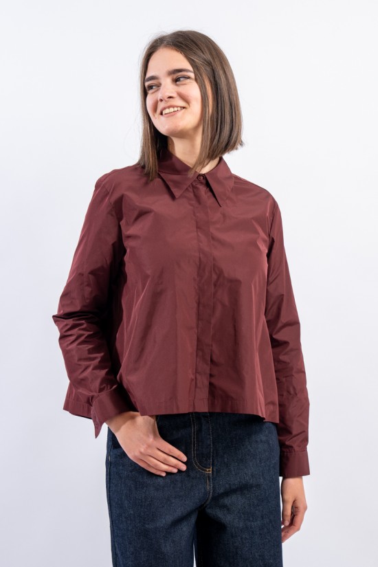 Shirt jacket made of taffeta, feminine and contemporary. It features a shirt collar and cuffs. Embellished on the back with pleats that create movement and give volume.