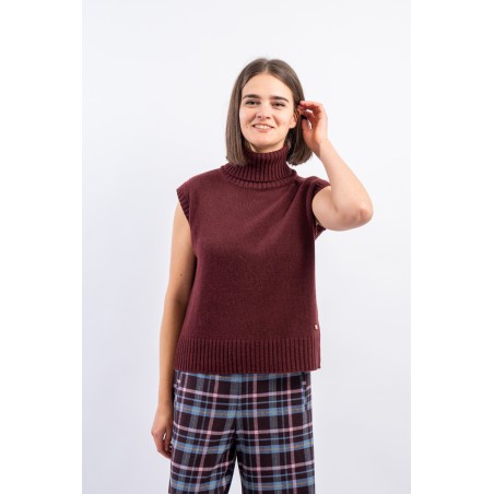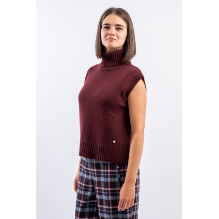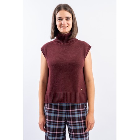 Knitted vest with high collar made of a soft wool and viscose yarn. It features ribbed collar and piping. Regular fit.